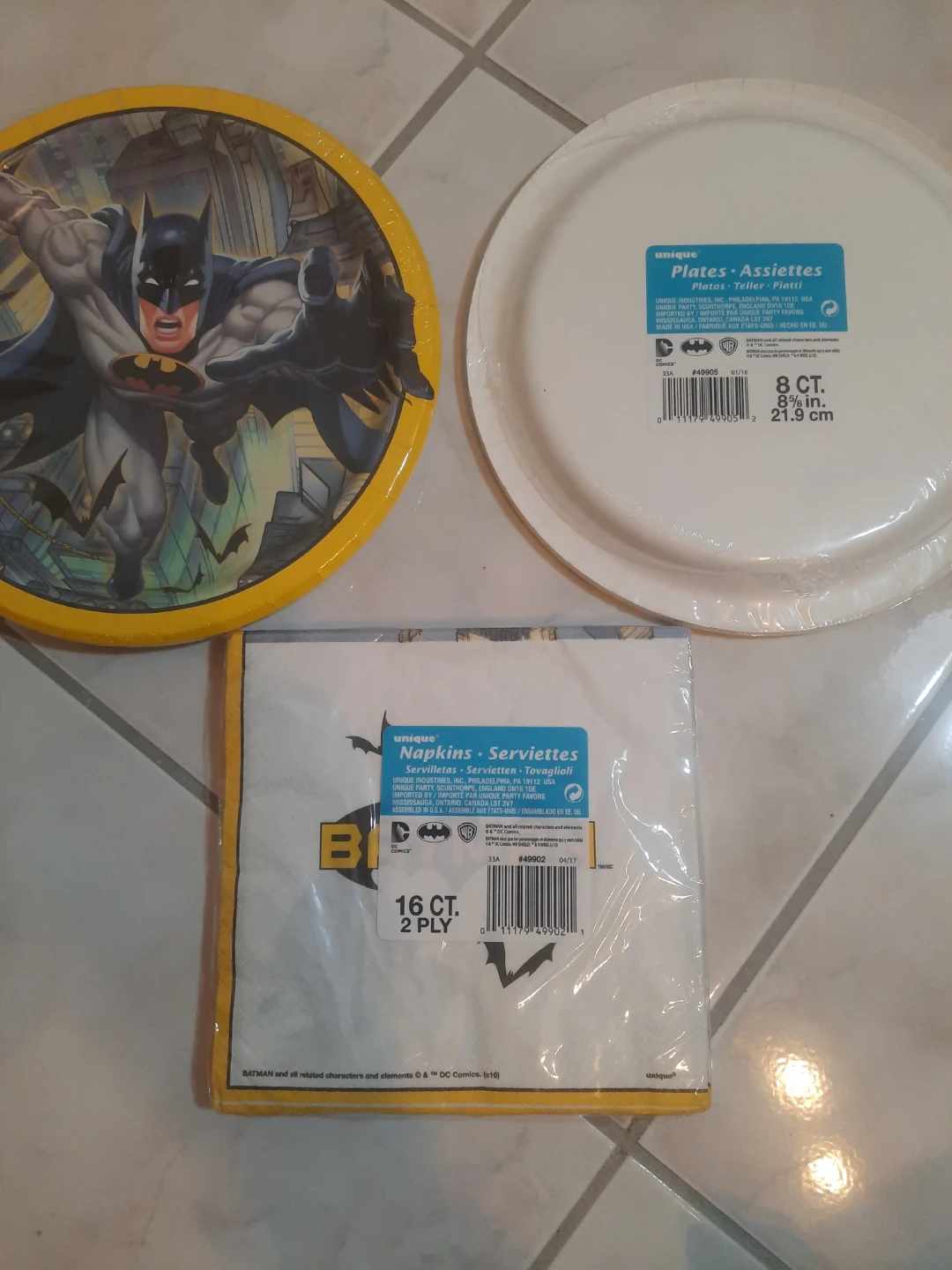 This set includes Unique brand Batman themed paper plates and napkins. Perfect for a Batman fan's party!