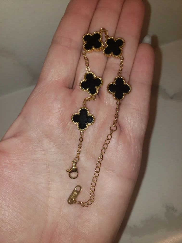 Stainless steel bracelet , 18K gold plated .Features four black clover charms. Gold coloured chain. Lobster clasp , adjustable. Brand new