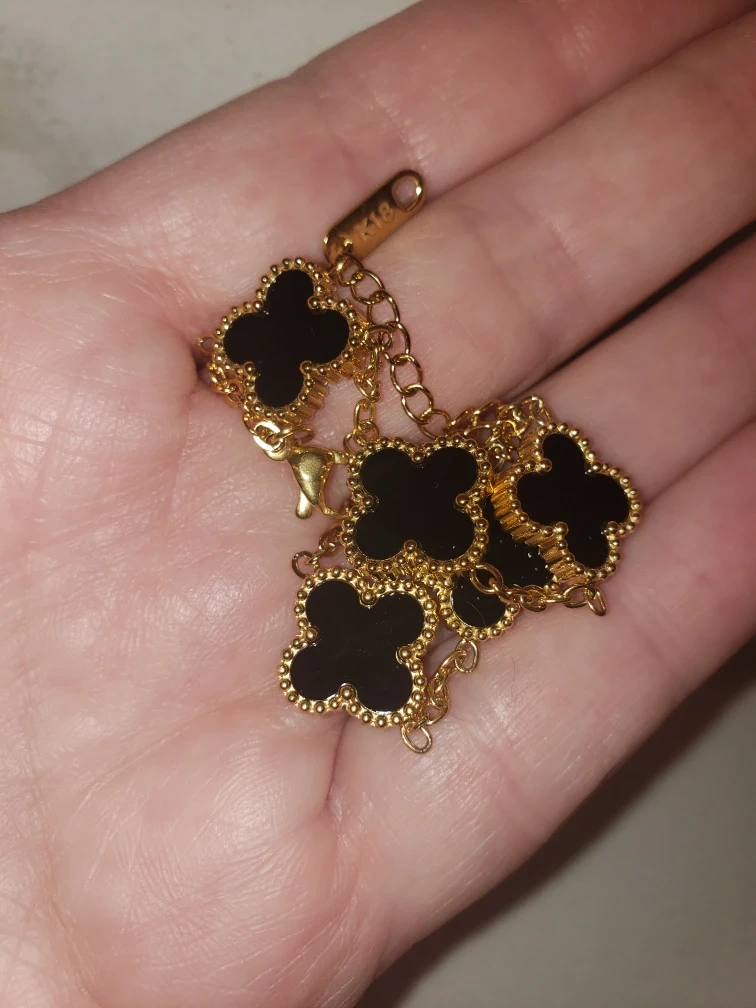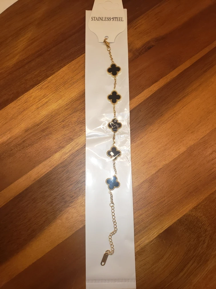Stainless steel bracelet , 18K gold plated .Features four black clover charms. Gold coloured chain. Lobster clasp , adjustable. Brand new