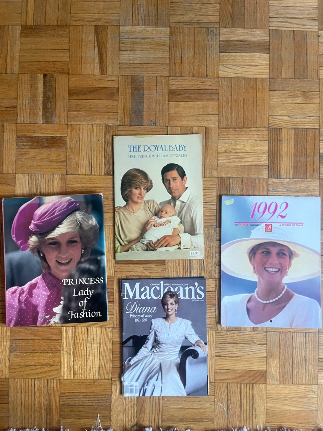 This lot includes several vintage magazines and a book featuring the British Royal Family, specifically Princess Diana and Prince William. Items cover topics like 'The Royal Baby' and 'Diana, Princess of Wales'.