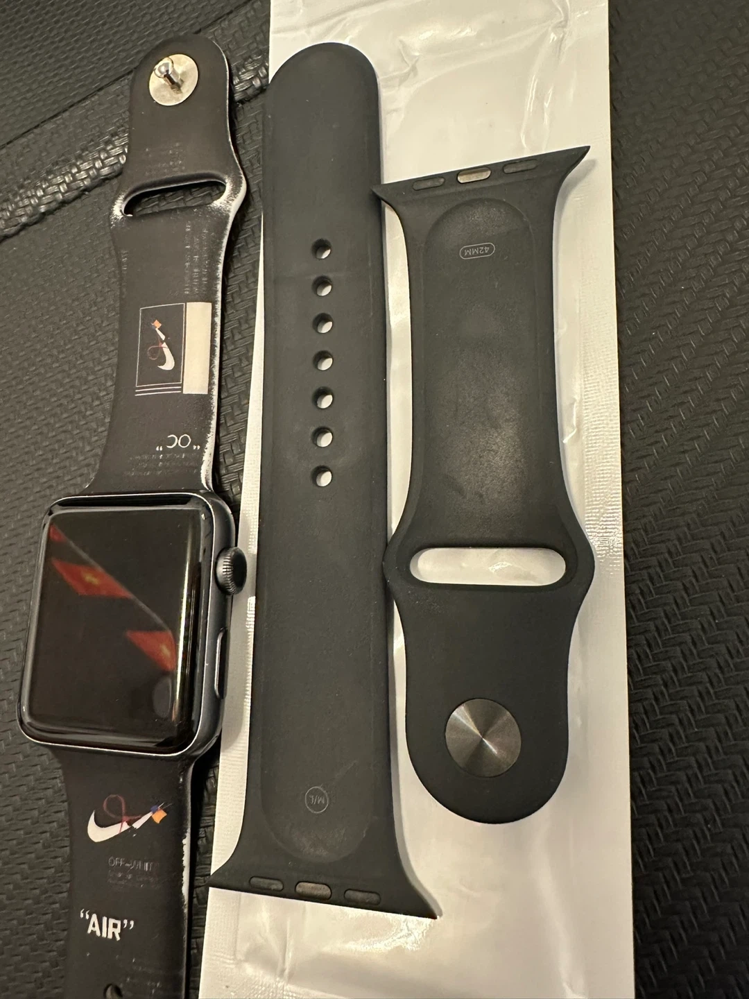 Apple Watch Series 3 GPS in Space Grey aluminum. It comes with a custom Off-White and Nike band, original Apple band, and charging cable.