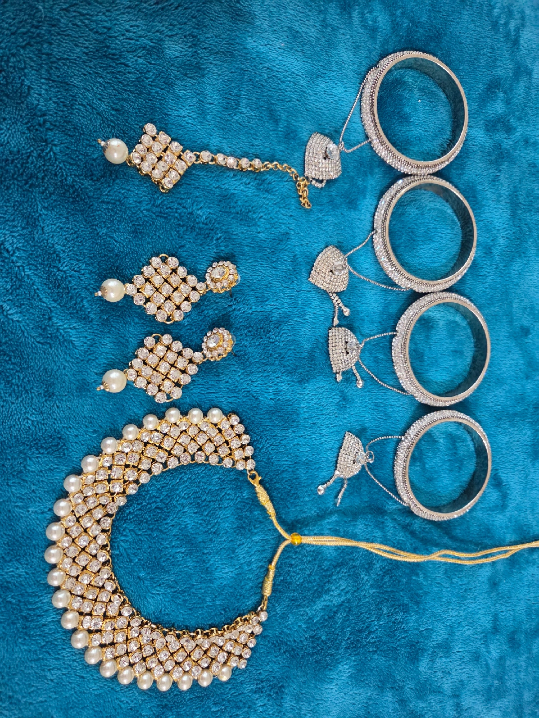 Selling a beautiful jewellery set that includes a necklace, a pair of earrings, and bangles tikka. The set features intricate detailing with stones and pearls, perfect for adding a touch of elegance to any outfit