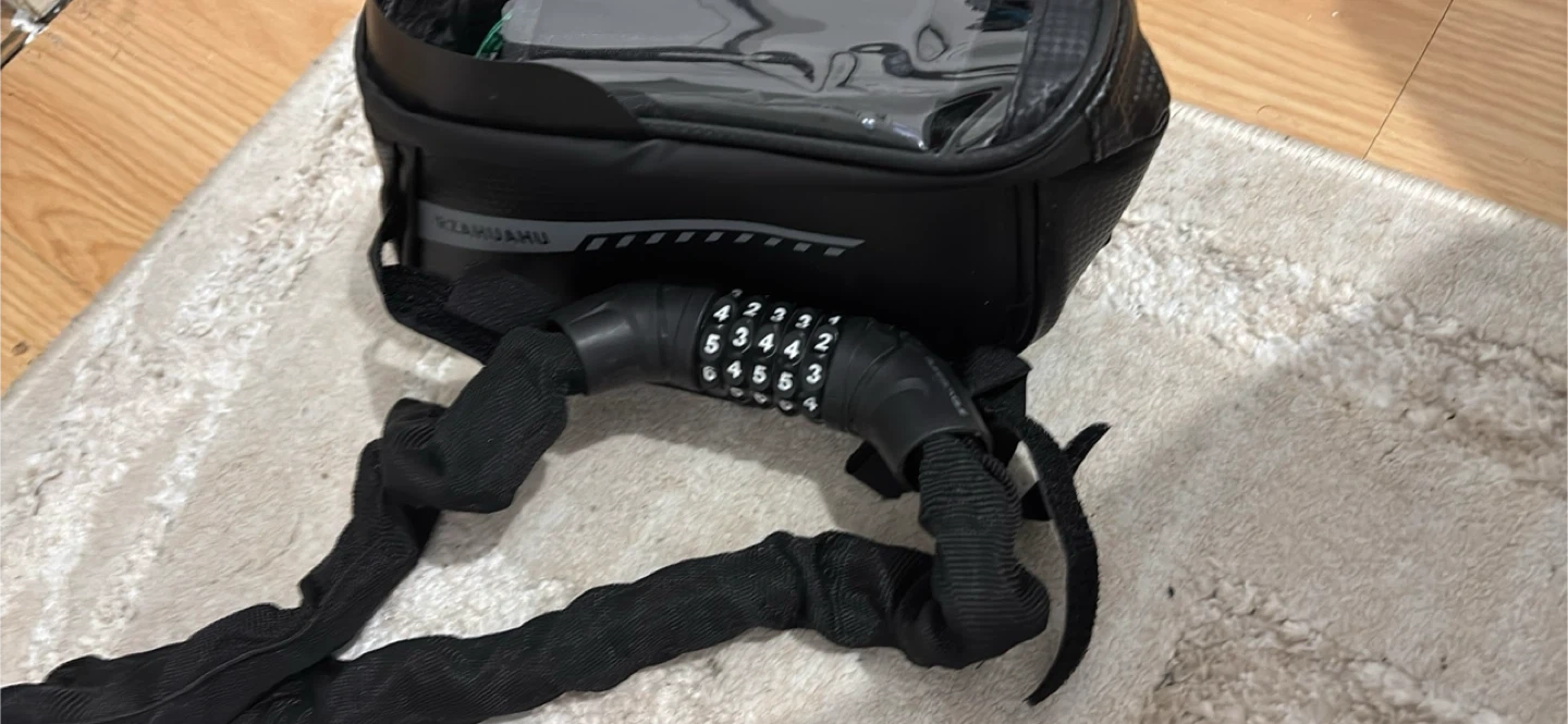 This black chain lock has a 4-digit combination. It also includes a bicycle bag with a clear top compartment. The lock is covered in a protective fabric sleeve.