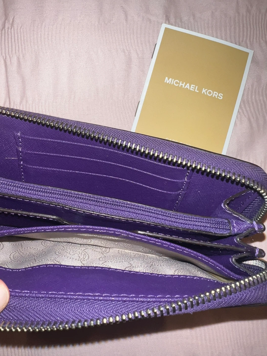 This Michael Kors wristlet wallet is a vibrant purple colour. It's made of textured leather and has multiple card slots and compartments inside. A care card is included.