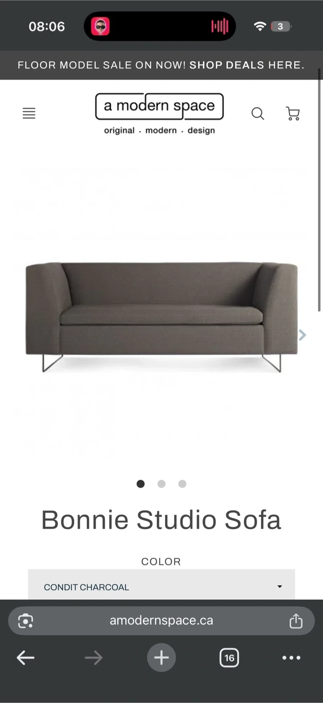 Selling a Bonnie Studio Sofa from A Modern Space in charcoal fabric with black legs. This is a high-quality modern designer piece that currently retails for about $2,800 CAD!