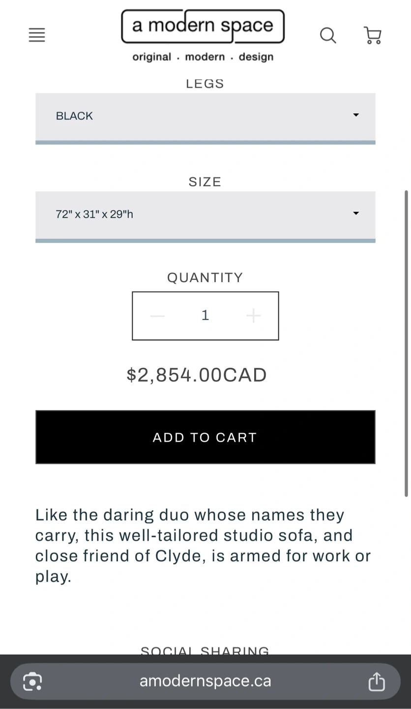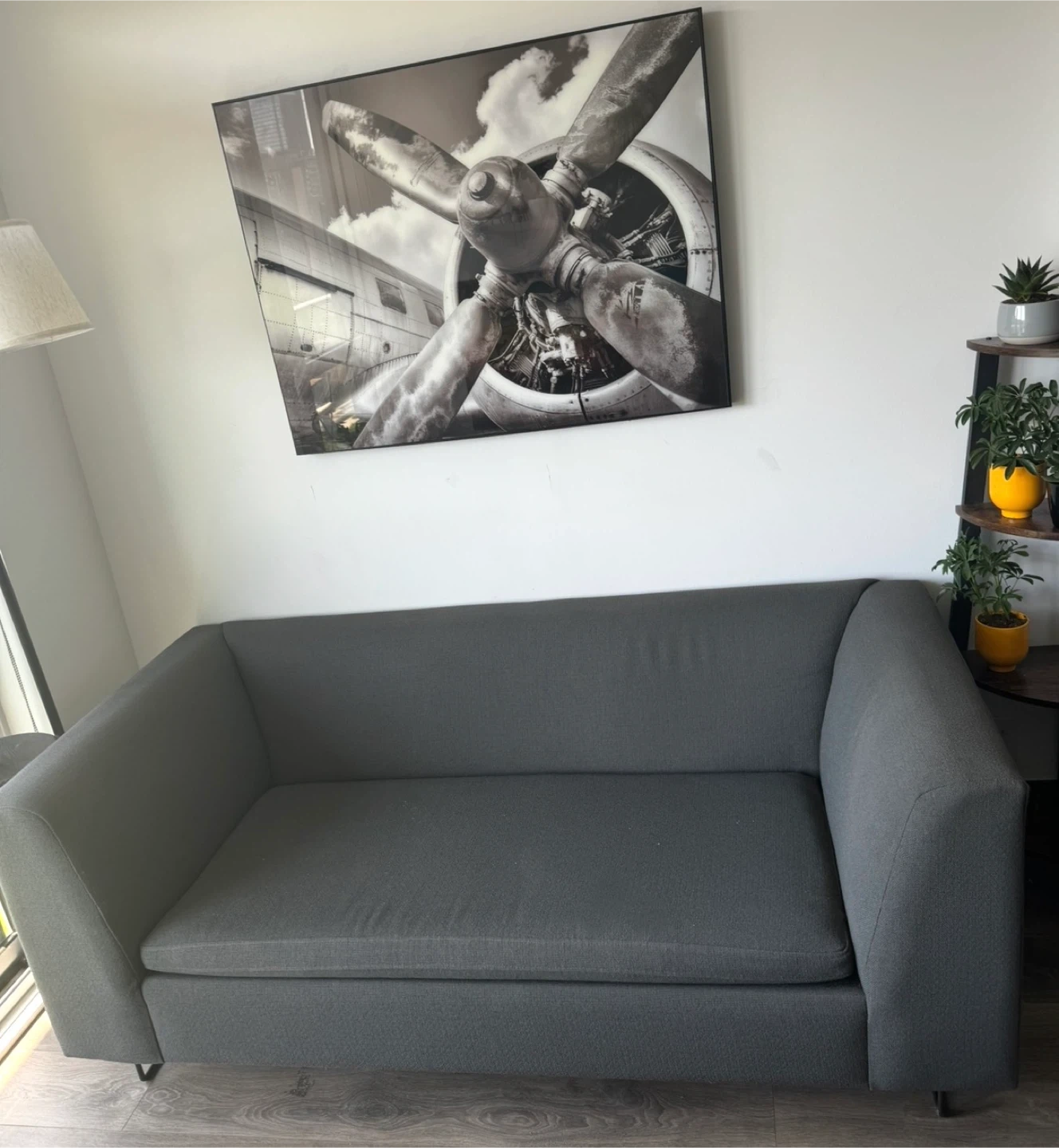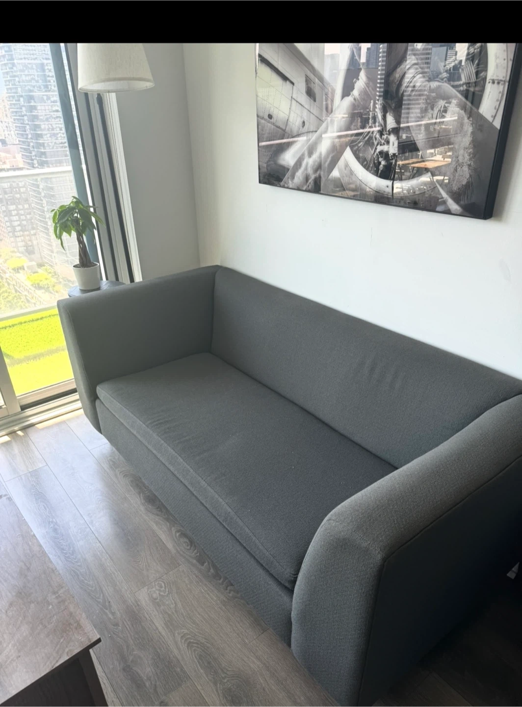Selling a Bonnie Studio Sofa from A Modern Space in charcoal fabric with black legs. This is a high-quality modern designer piece that currently retails for about $2,800 CAD!