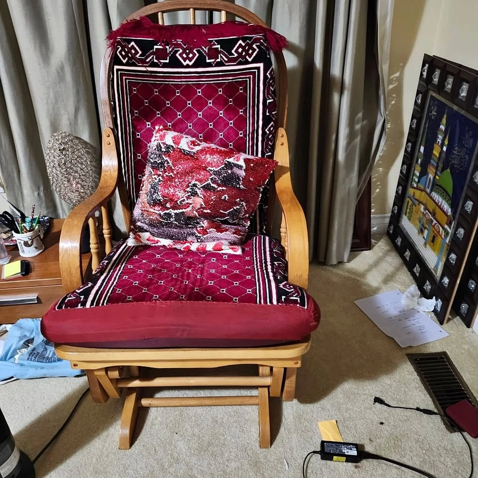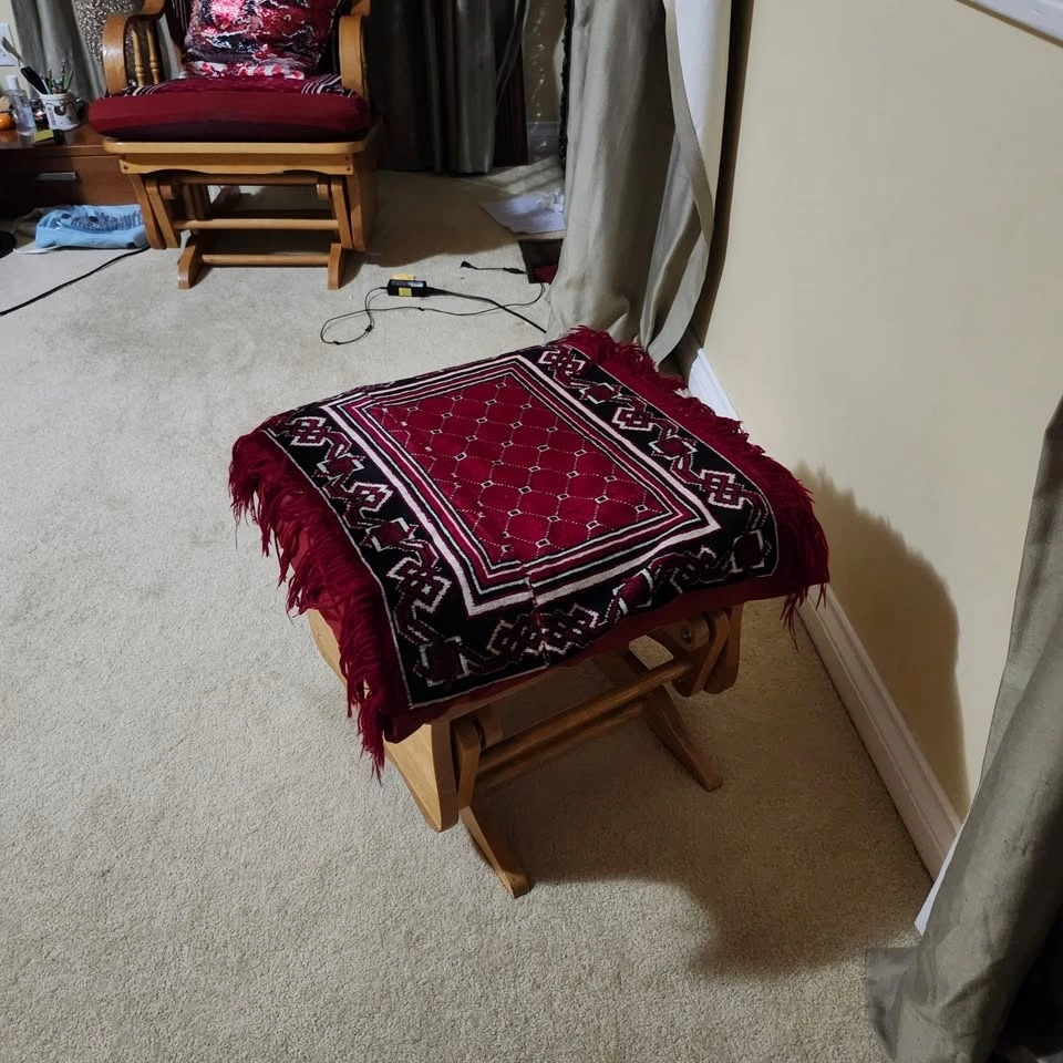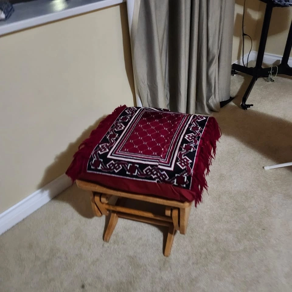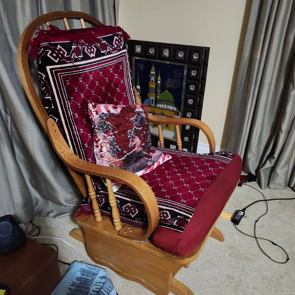 Beautiful wooden glider rocking chair and matching gliding ottoman for sale. Perfect for a nursery, reading nook, or living room. Both the chair and the footstool have a smooth gliding mechanism for maximum comfort. The wood frame is sturdy and well-cared for. Includes the decorative red patterned covers and a sequin accent pillow as shown in the photos. Neutral wood tone fits well with most home decor. Asking $50. Pickup in South Surrey/White Rock.