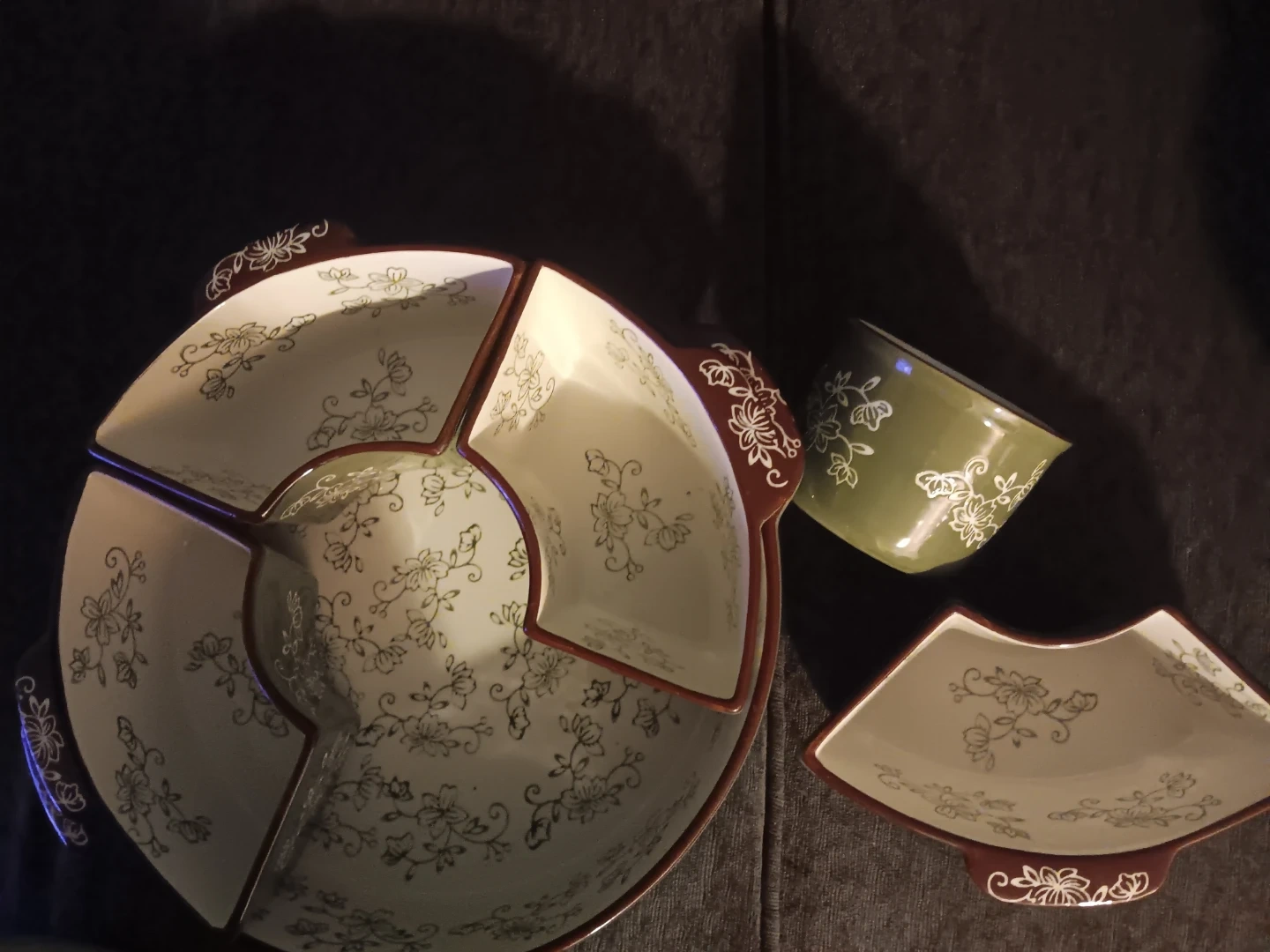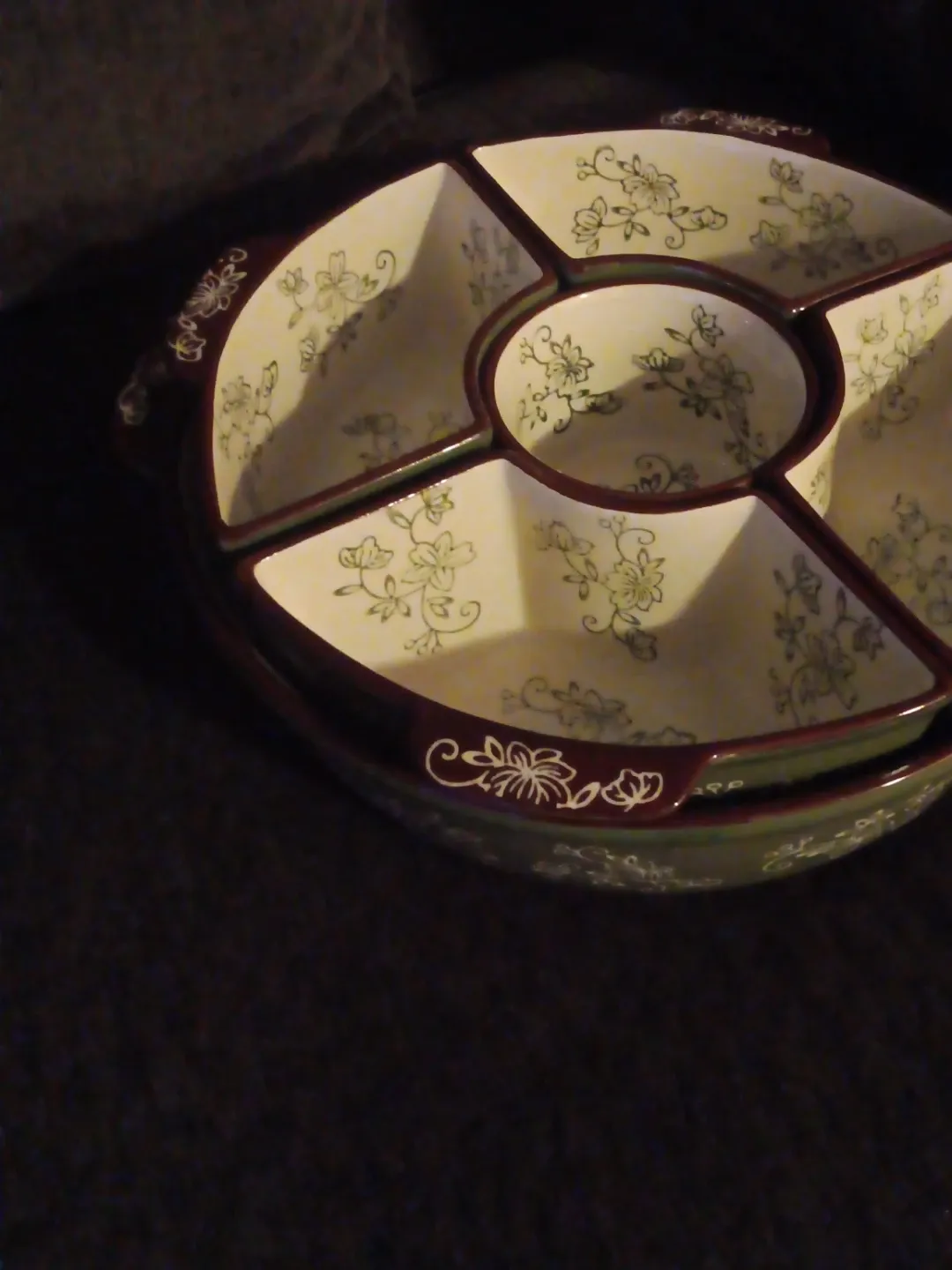 This ceramic serving platter has a green exterior and a cream interior with a floral pattern. It features five sections for serving snacks or appetizers. It's perfect for gatherings and parties!