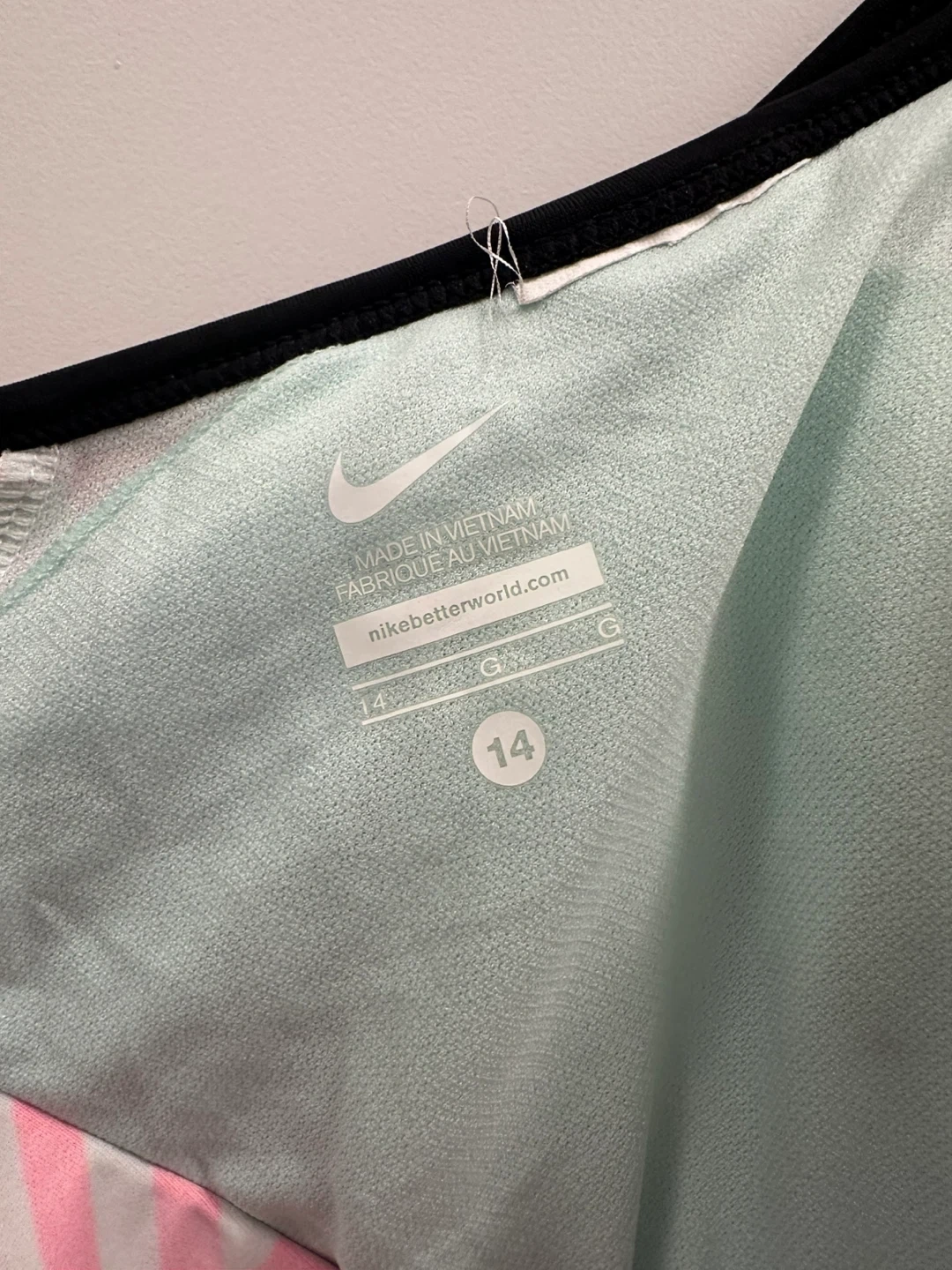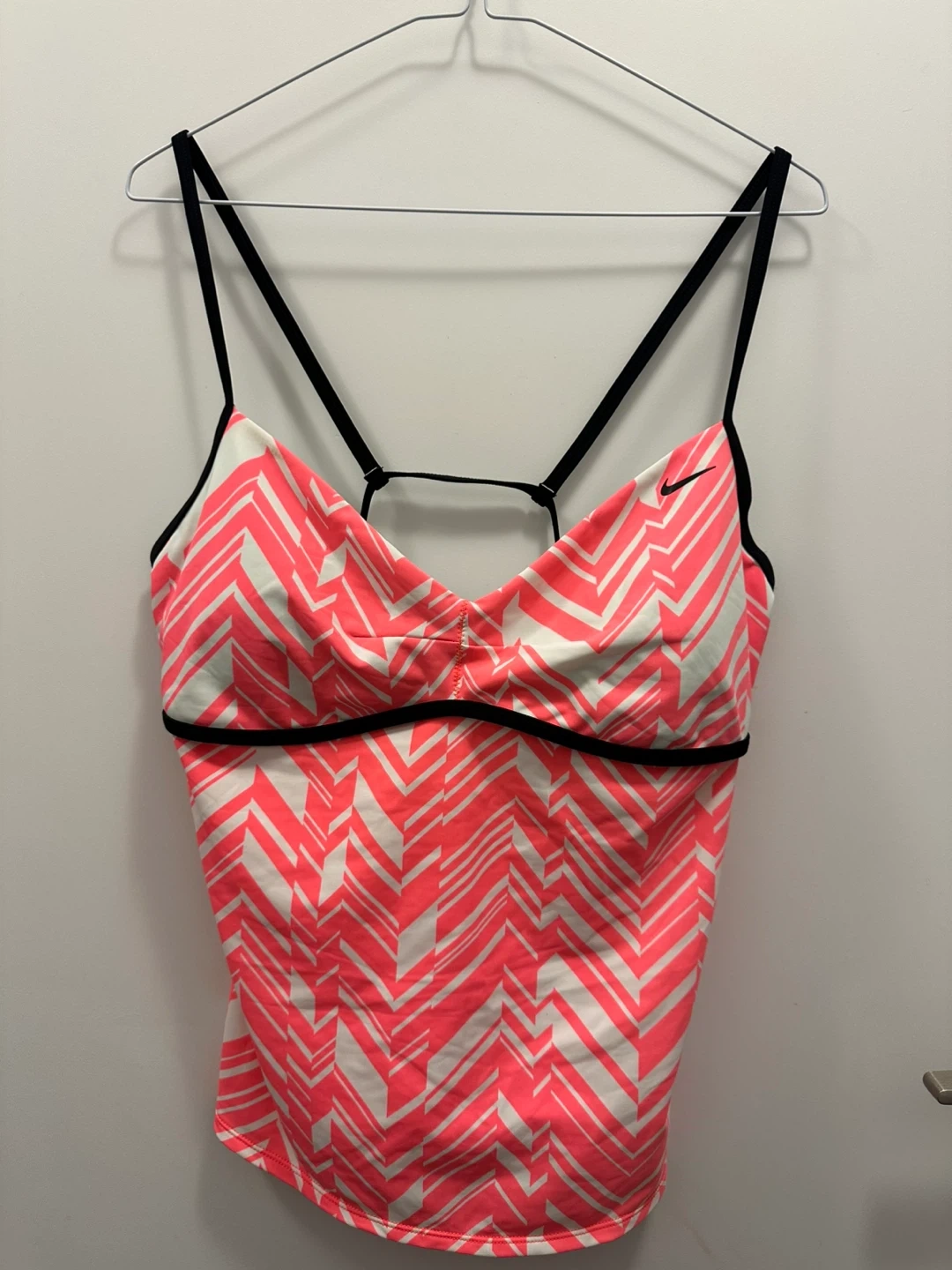 *Like new, only worn once*. Ladies Nike swim top in size 14. Features a fun pink and white chevron pattern with black straps.