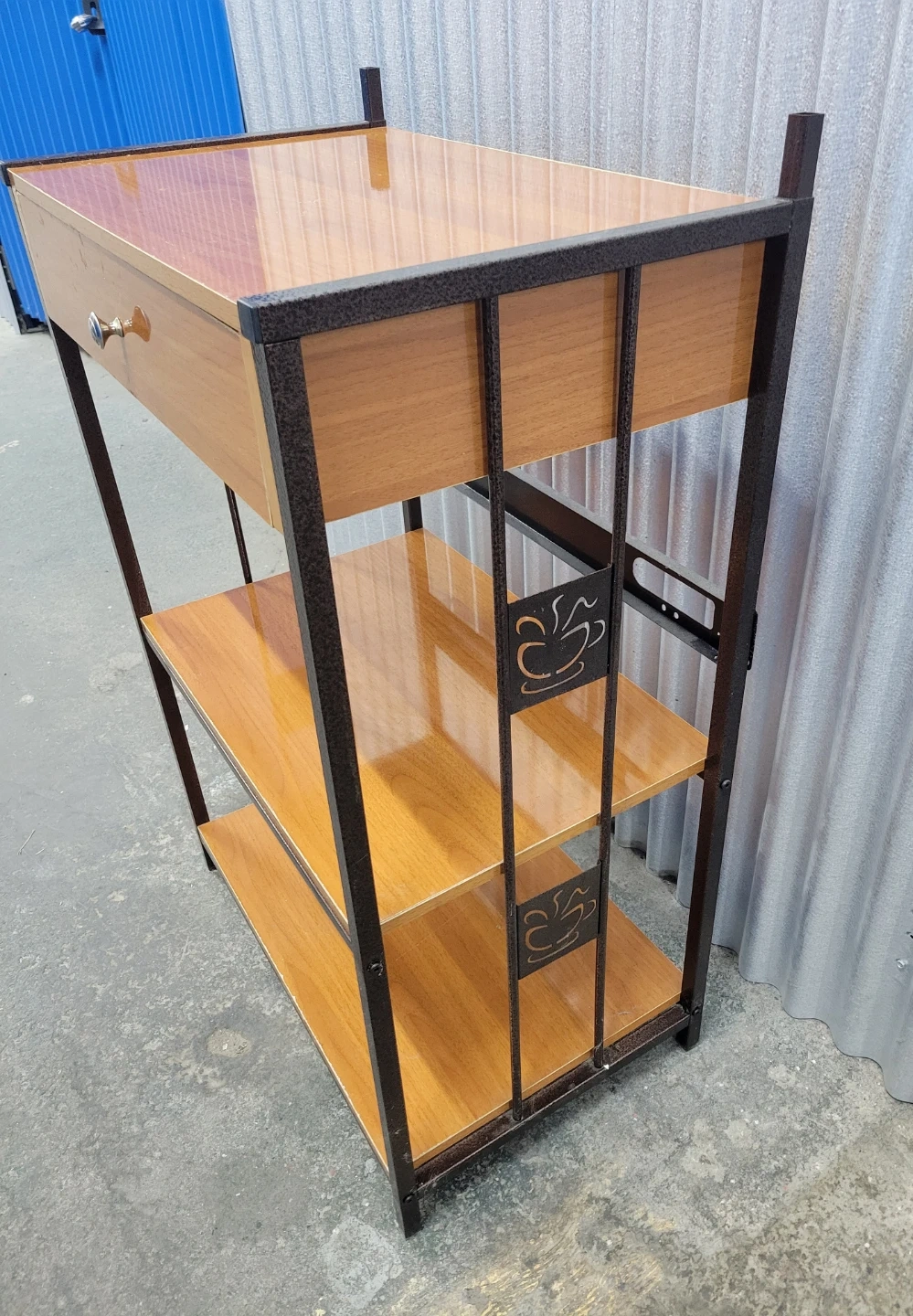 This shelf unit features a wood grain finish with a decorative metal frame. It includes a single drawer for storage and two open shelves below. Its compact size makes it suitable for various spaces.