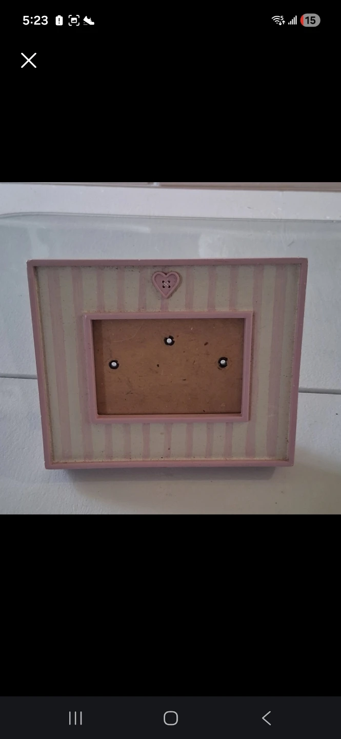 Sweet pink and white striped photo frame. Features a decorative heart button accent. Holds one photo.