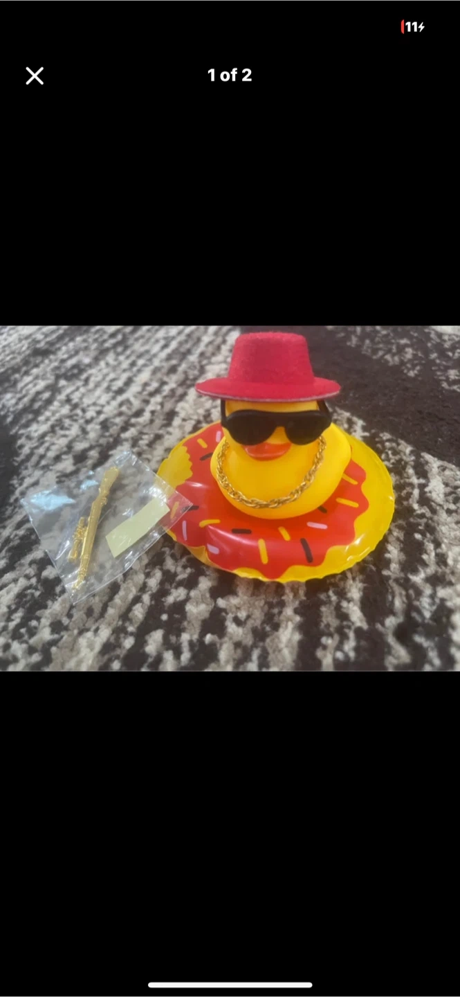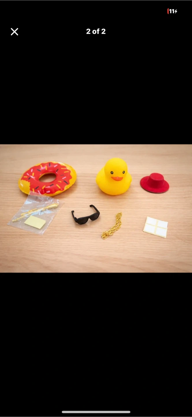 This fun set includes a yellow rubber duck dressed in a red hat, sunglasses, and a gold chain. It also comes with a donut-shaped float and some small accessories in a bag. It's a playful item for bath time or decoration!