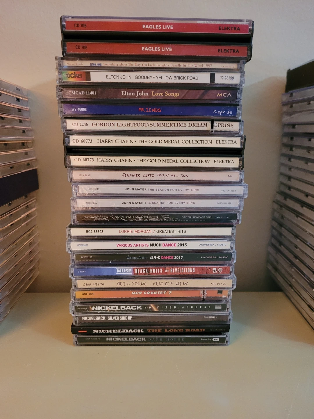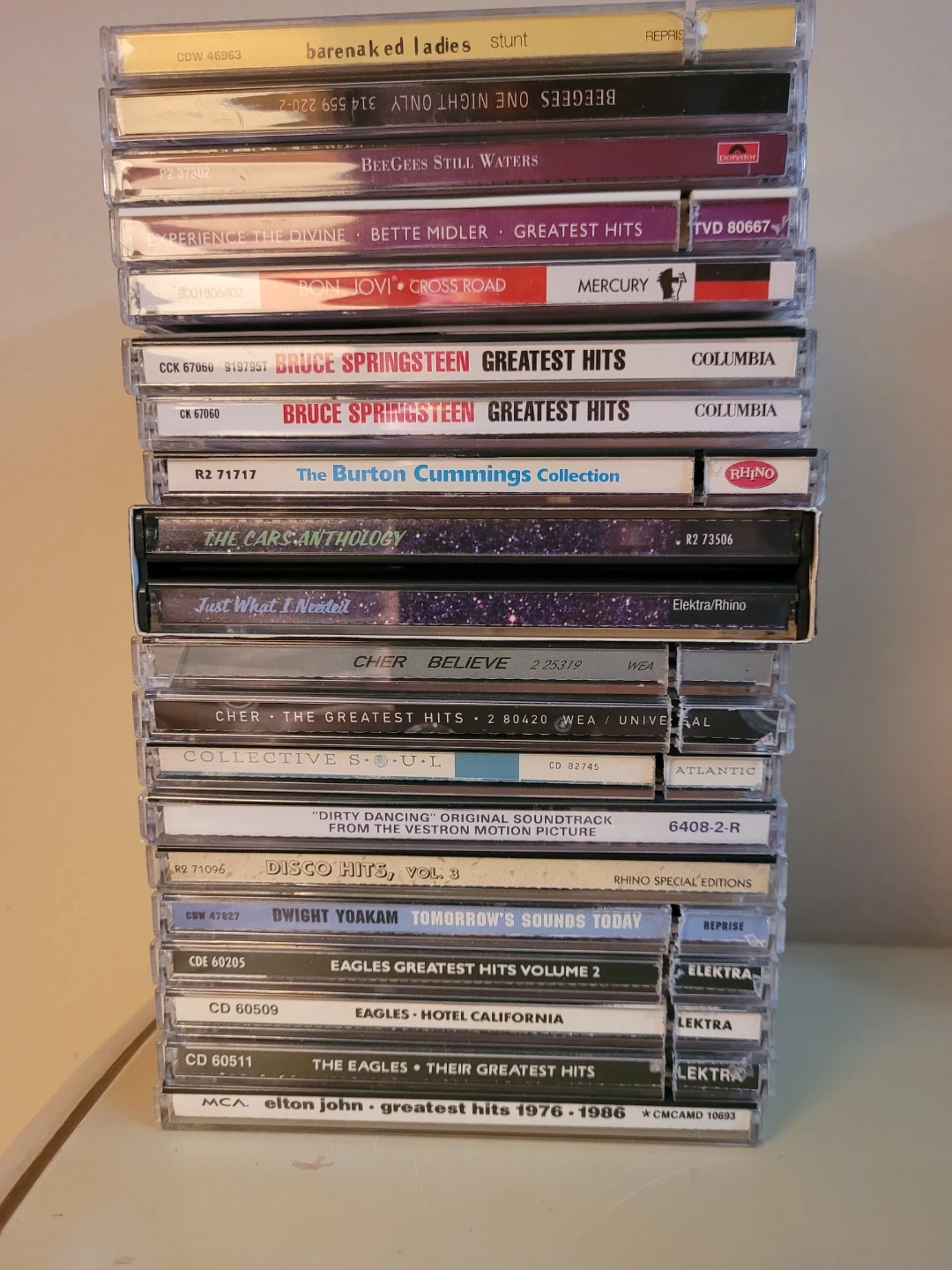 A large collection of music CDs featuring various artists and genres. This lot includes artists like Eagles, Elton John, Rod Stewart, Cher, and many more. Cases and discs are in good condition. Several multi-disc sets are included. Selling as a lot.