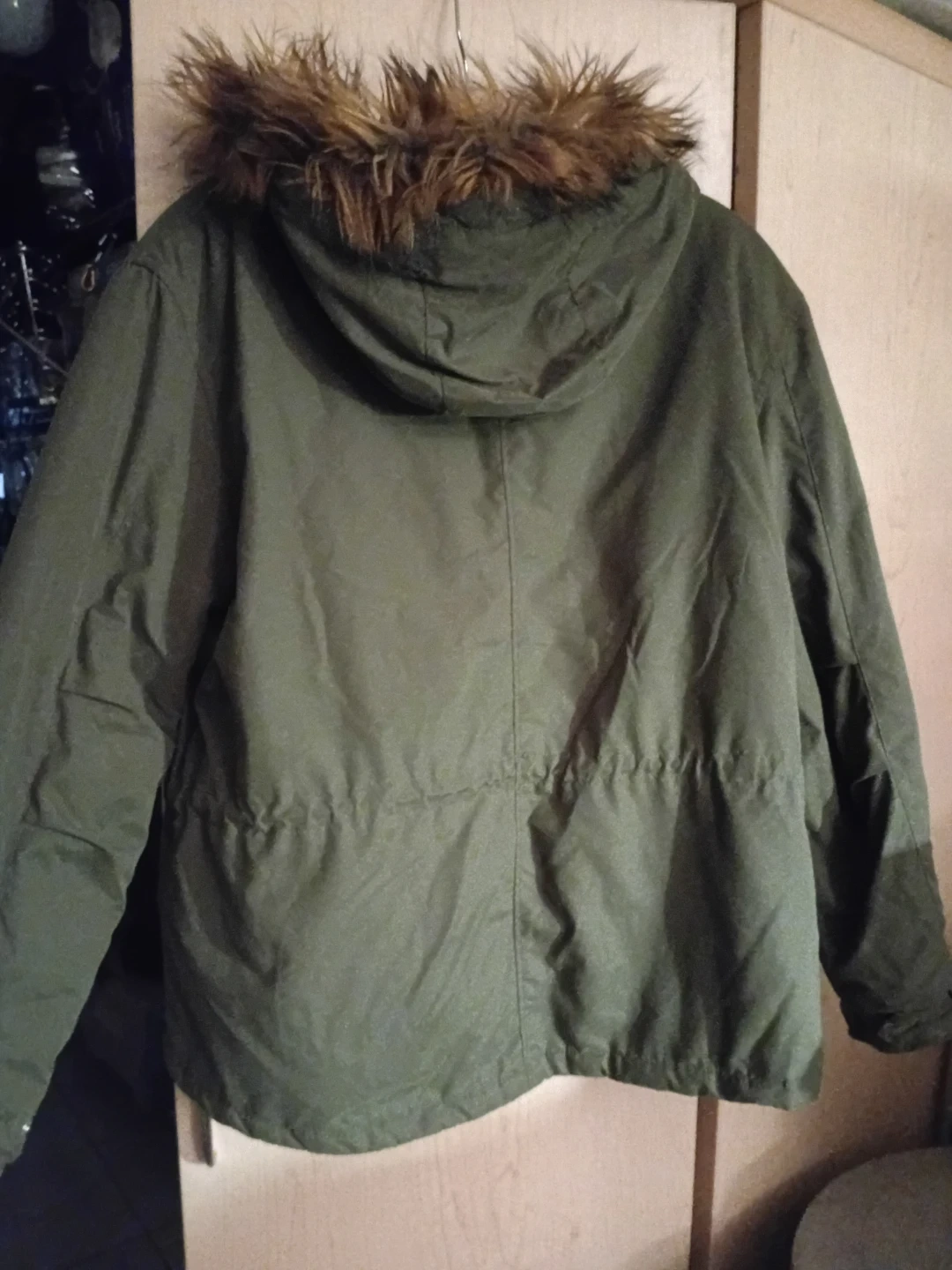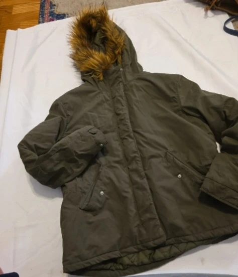 Olive green parka jacket with a cosy faux fur lined hood. It features a full zip closure and adjustable waist tie. This jacket is perfect for staying warm during cooler weather!