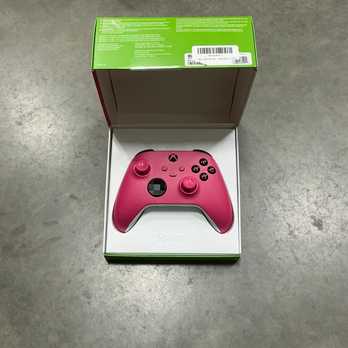 This is an Xbox wireless controller in Deep Pink. It comes in its original box and packaging. Get your game on with this vibrant controller!