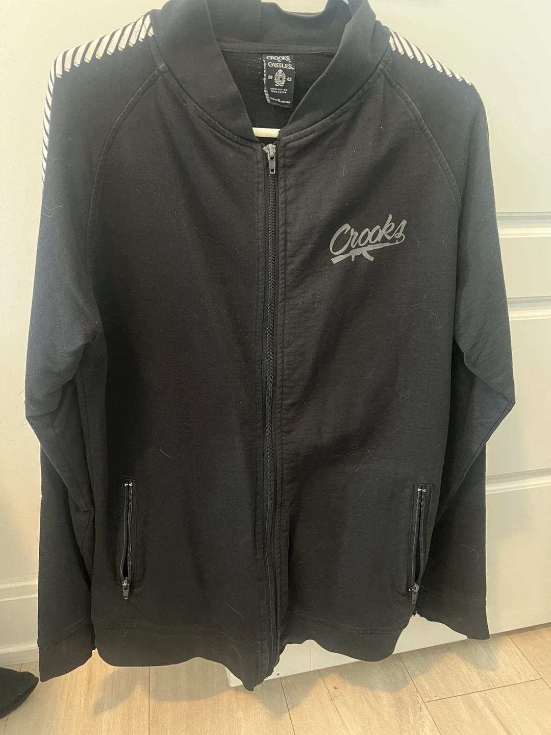 Black zip-up track jacket from Crooks & Castles. Features white striped detailing on the sleeves and front logo. It has zippered pockets.