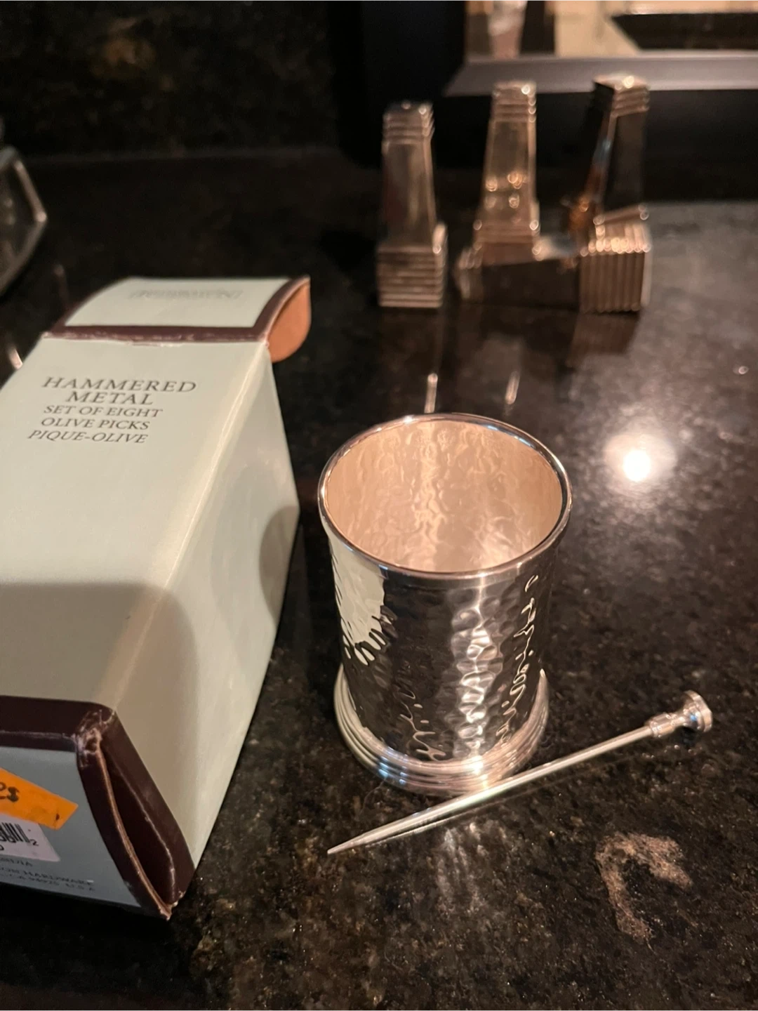 Buy & SellHammered Metal Olive Picks SetHammered Metal Olive Picks Set$25Hammered metal set of eight olive picks. Includes a holder and one pick. Perfect for serving appetizers!ConditionNewWHERE TO MEETAspenwoodView MapSELLERHeatherNoons Creek181 review0 chats·0 favorites·5 viewsSEND CHAT TO SELLERHi Heather! I’m interested in your listing.Hi Heather! I’m interested in your listing.Get the Karrot app to chatSign In to chat