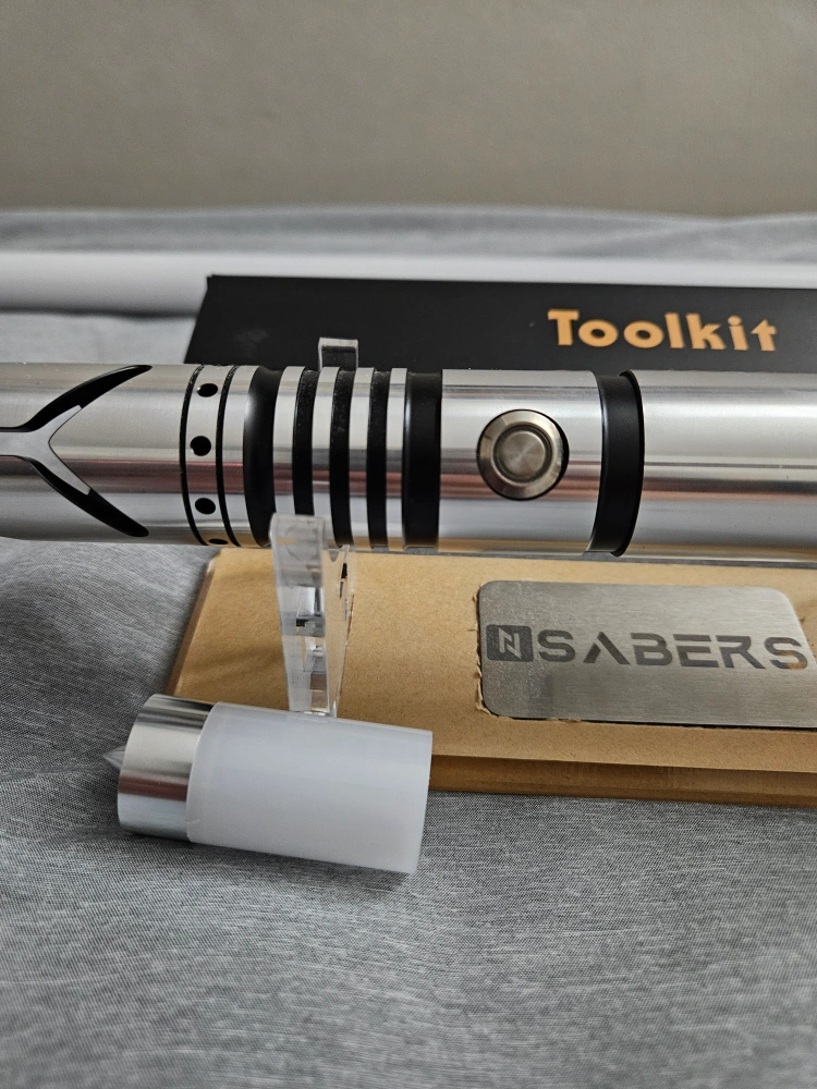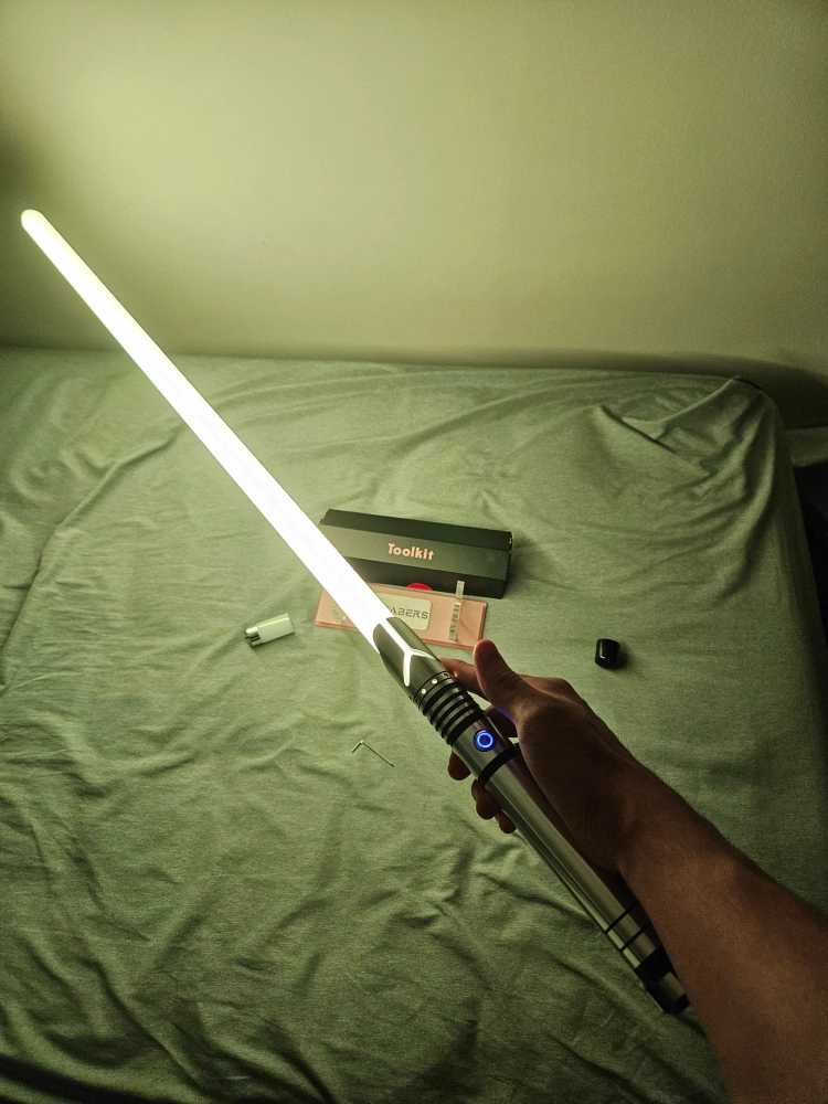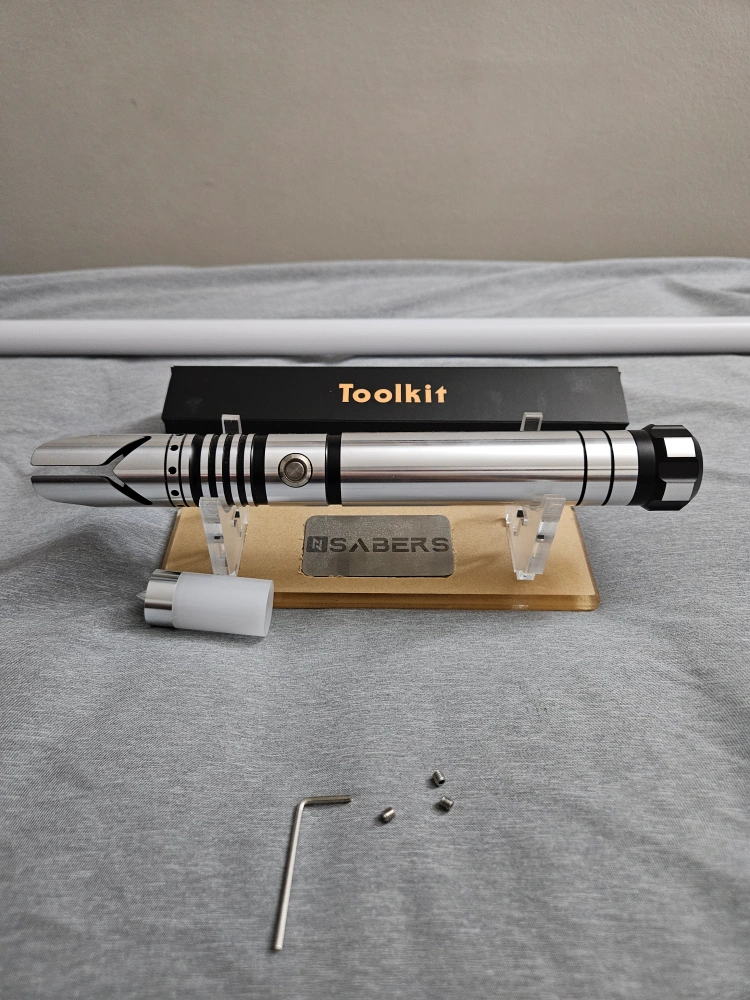 75Mandalorian Inspired Neopixel Lightsaber from NSABERS. USB-C Rechargable Battery. Has various options for colours and animations like ignition styles, and LOTS of sounds, effects, voice lines, and even music from the original soundtrack for Star Wars. Quite loud and bright! But u can customize the volume. Its motion activated, you will have to learn how to navigate using the videos on NSABERS website or YouTube. Includes: - Toolkit (for attaching blade to hilt) - Displaying Stand for Hilt - Lightsaber and blade unfortunately I don't have any box or carrying case so be careful with it when transporting. BLADE: 32inches HILT: 11inches