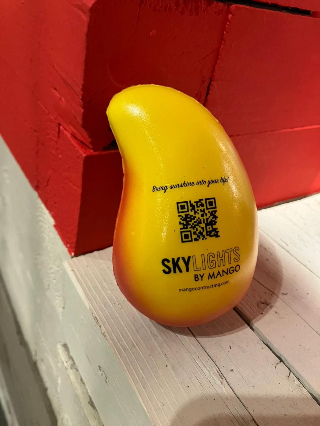 Here's a fun little stress reliever shaped like a mango from Skylights by Mango! It's bright yellow and fits comfortably in your hand