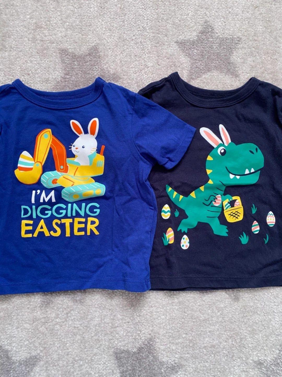 Two cute Easter-themed graphic t-shirts. Size 12-18 months. One is a bright blue with a bunny operating an excavator and says 'I'm Digging Easter'. The other is navy blue with a dinosaur wearing bunny ears and carrying an Easter basket