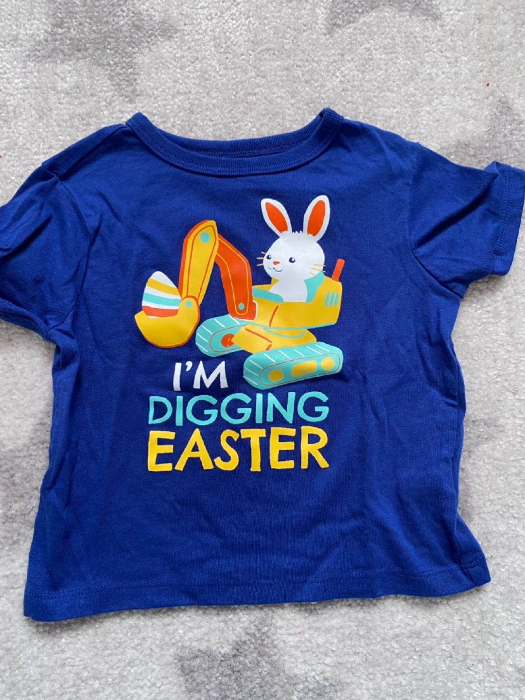 Two cute Easter-themed graphic t-shirts. Size 12-18 months. One is a bright blue with a bunny operating an excavator and says 'I'm Digging Easter'. The other is navy blue with a dinosaur wearing bunny ears and carrying an Easter basket