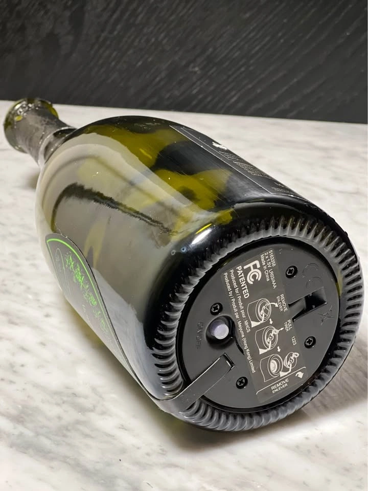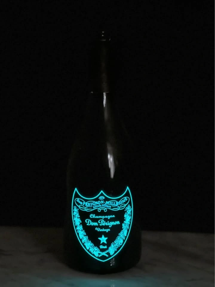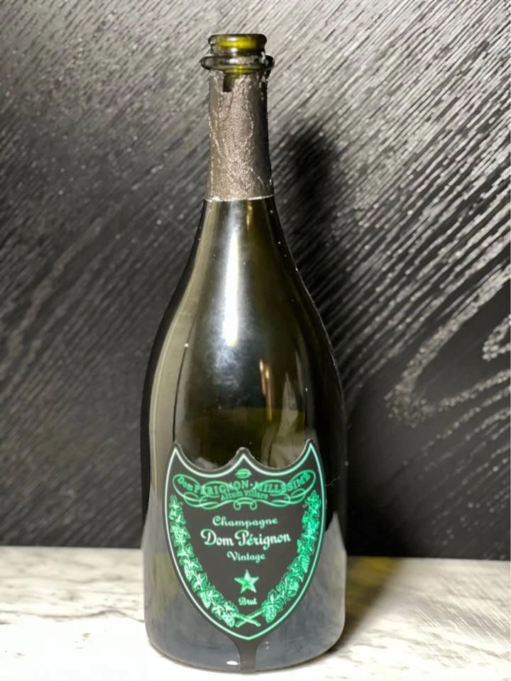 This is an empty bottle of Dom Pérignon Luminous Vintage champagne. It is a special edition bottling featuring a label that glows in the dark, intended for nighttime celebrations. The luminous effect can last for approximately 8 to 10 hours and is activated by a small switch at the bottom of the bottle.