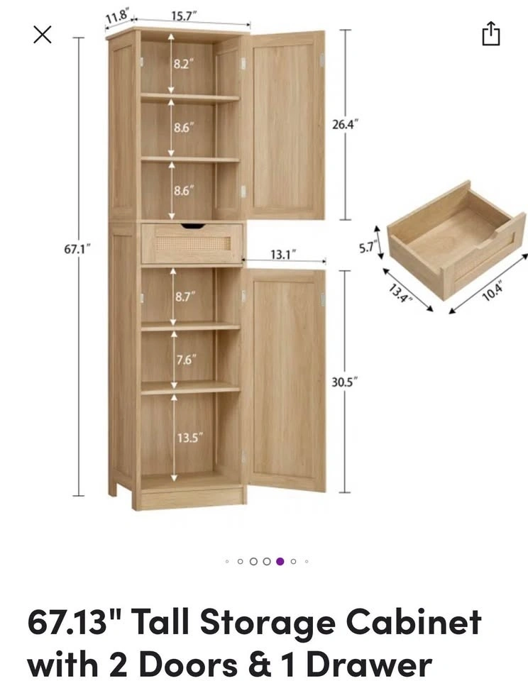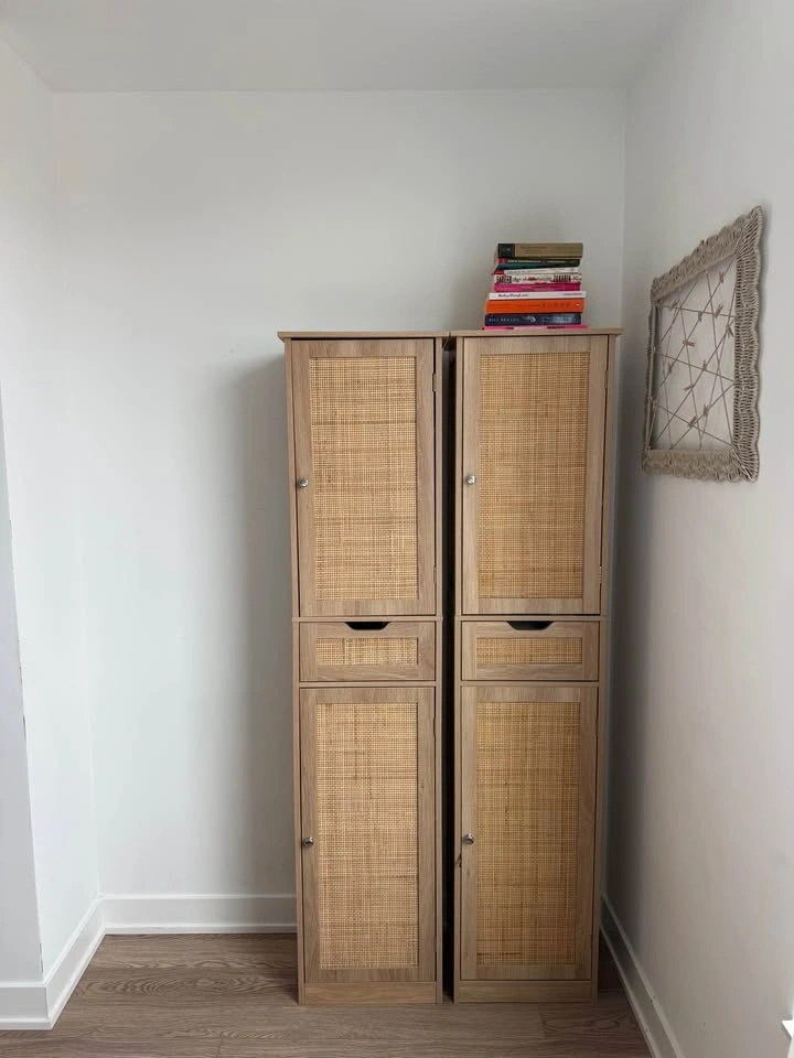 Beautiful 67” tall storage cabinet with cane rattan door panels and a warm natural wood finish. Super versatile — works great as a pantry, linen closet, entryway storage, bathroom cabinet, and more. Features: 2 doors + 1 rattan-front drawer, 5 adjustable interior shelves. Dimensions: 15.7”W × 11.8”D × 67.1”H. Have two available — buy one for $175 or both for $300. Both are in excellent condition. Local pickup only. Bathurst & Richmond st west.