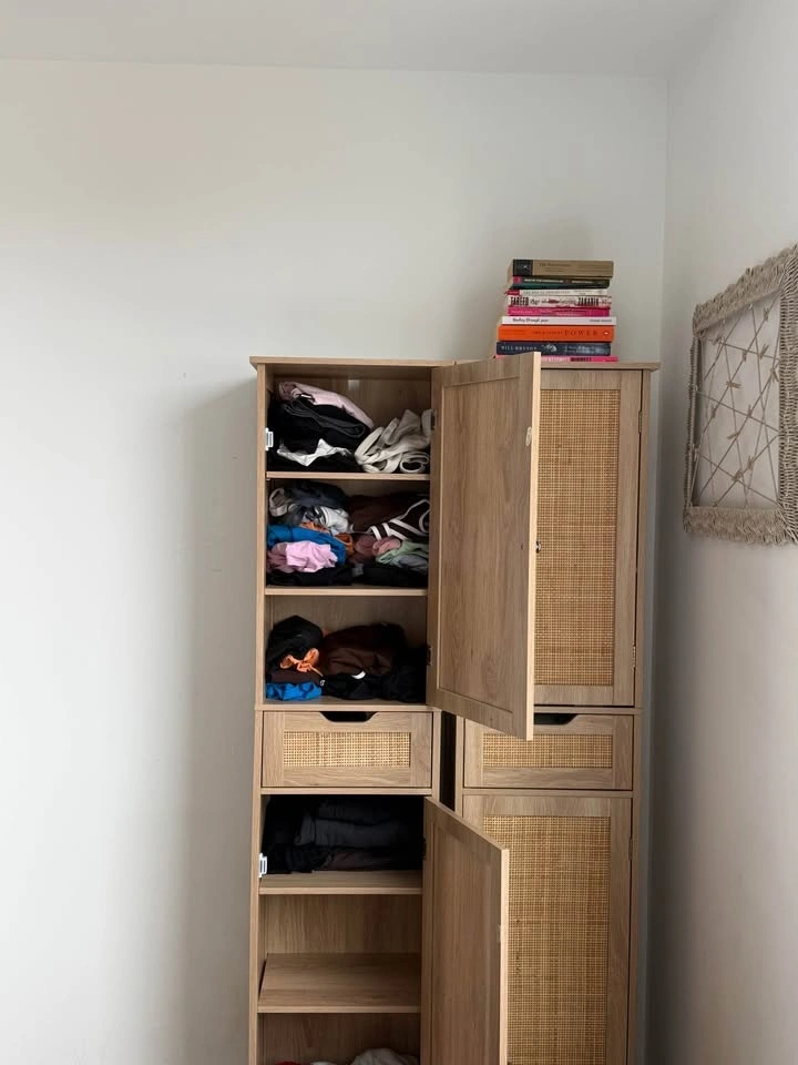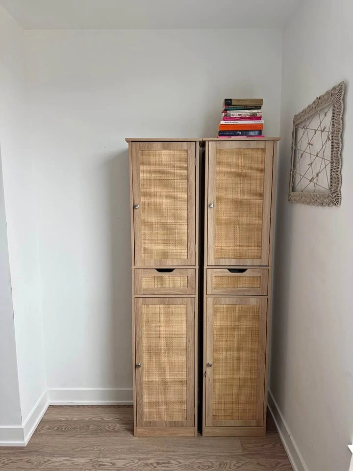 Beautiful 67” tall storage cabinet with cane rattan door panels and a warm natural wood finish. Super versatile — works great as a pantry, linen closet, entryway storage, bathroom cabinet, and more. Features: 2 doors + 1 rattan-front drawer, 5 adjustable interior shelves. Dimensions: 15.7”W × 11.8”D × 67.1”H. Have two available — buy one for $175 or both for $300. Both are in excellent condition. Local pickup only. Bathurst & Richmond st west.