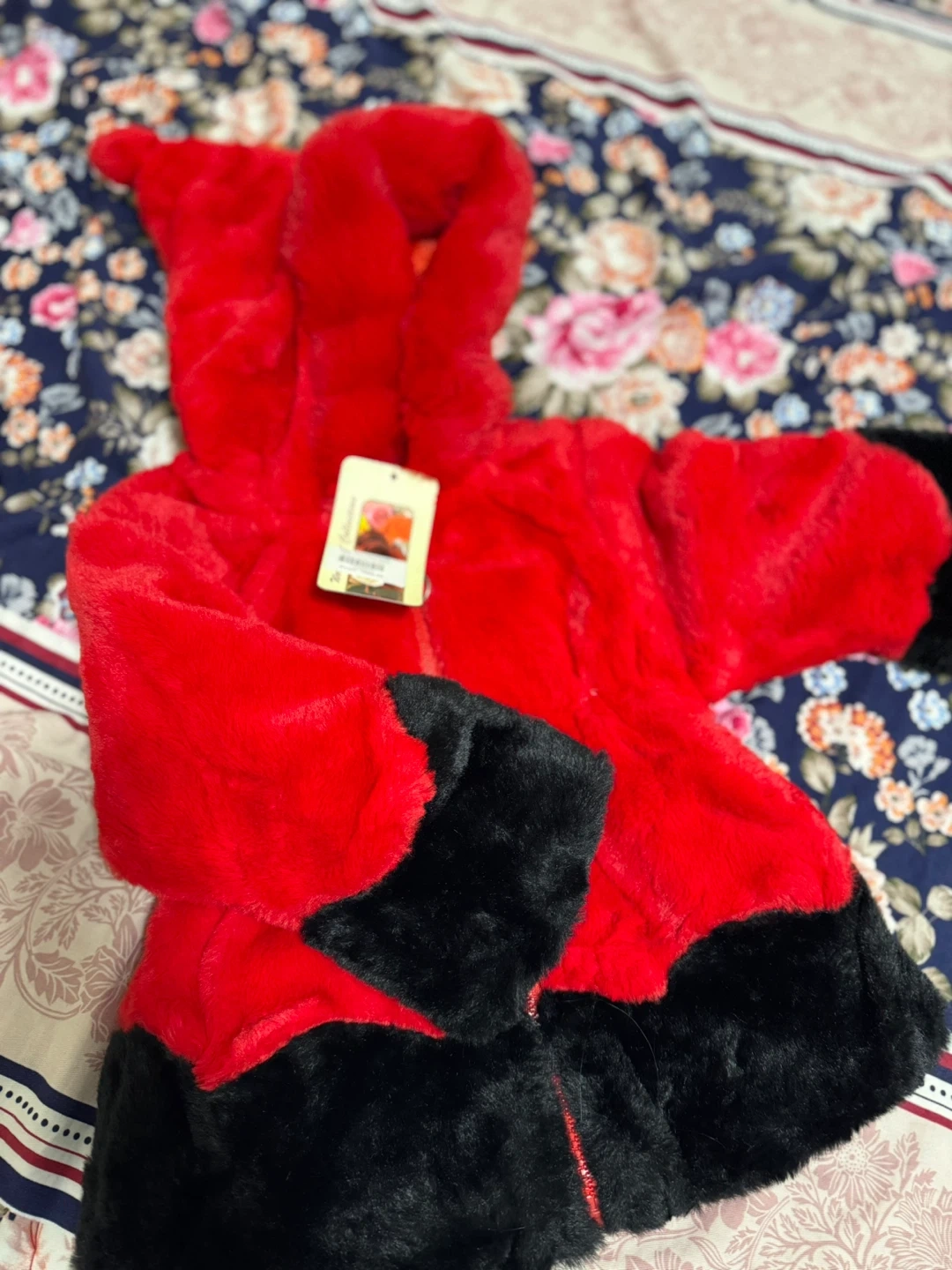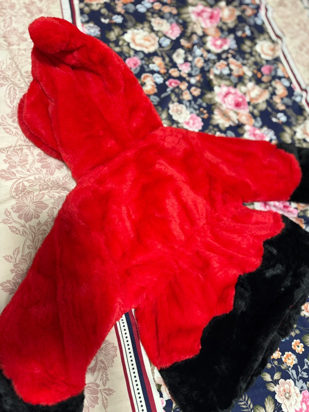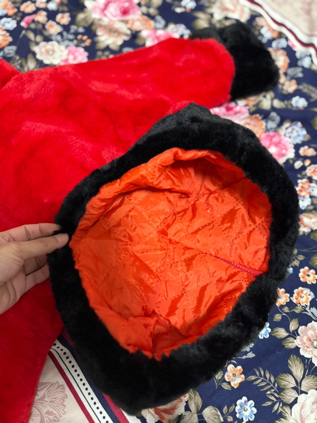Brand new Cozy faux fur hooded jacket in bright red with black accents. It's lined with quilted orange fabric for extra warmth. This jacket zips up the front.