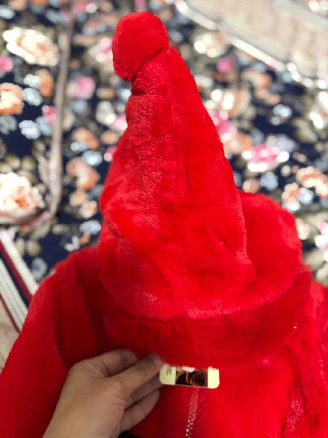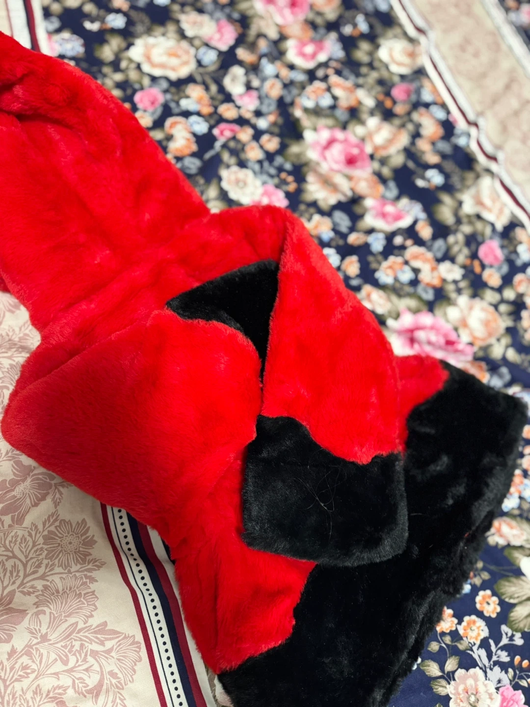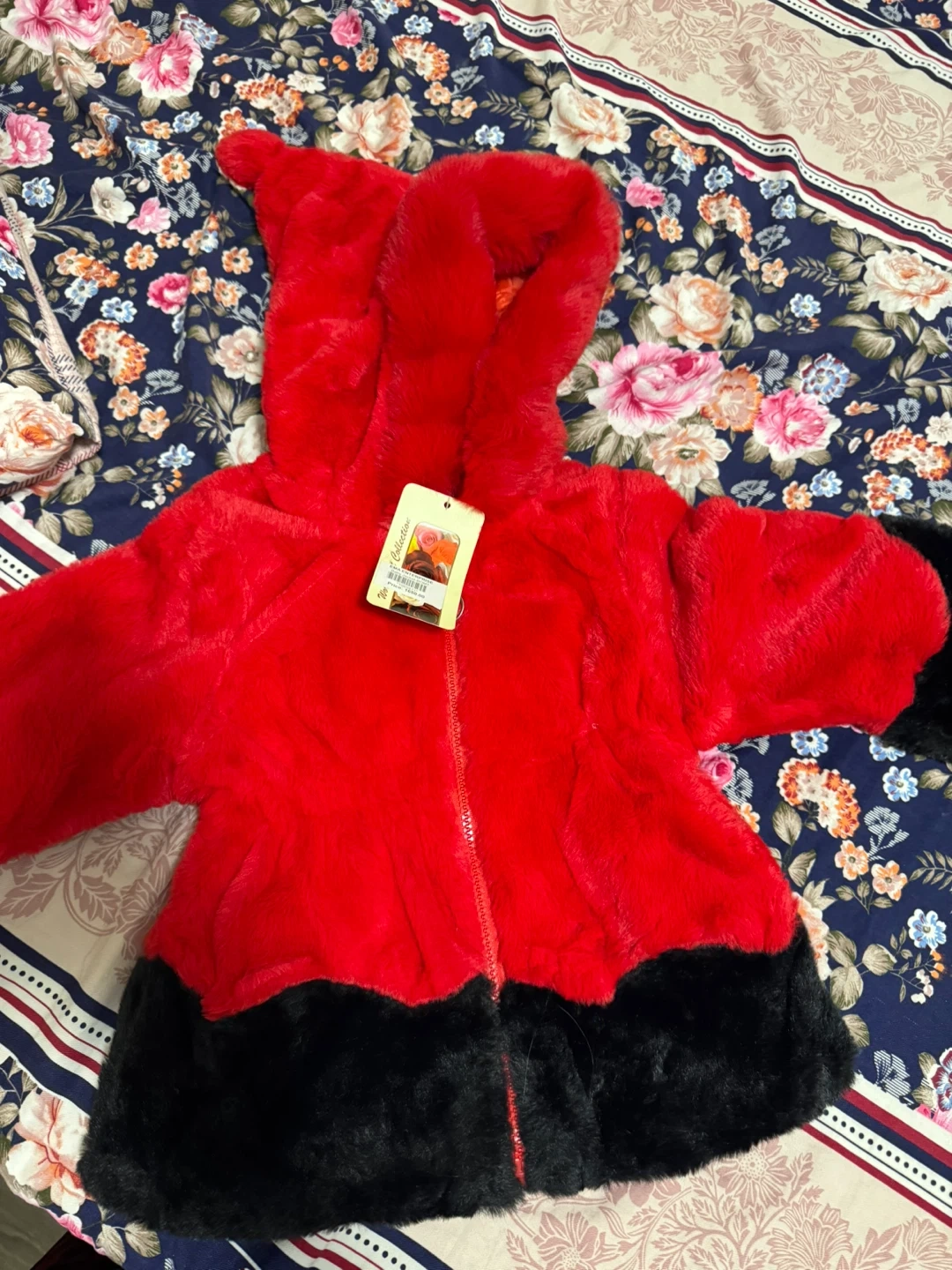 Brand new Cozy faux fur hooded jacket in bright red with black accents. It's lined with quilted orange fabric for extra warmth. This jacket zips up the front.