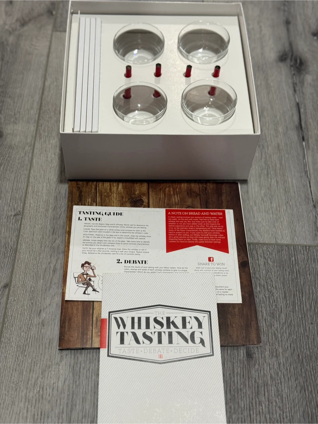 Includes everything needed for a whiskey tasting experience. It comes with four glasses and tasting guides. Perfect for anyone looking to explore different whiskeys!
