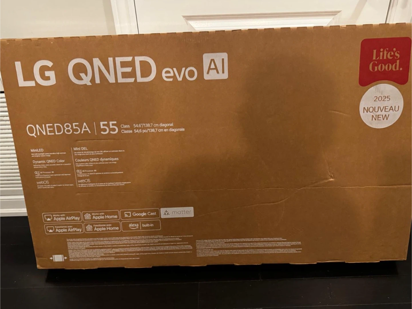 This is an LG 55-inch QNED Mini LED 4K Smart TV. It features Quantum Dot and NanoCell technology for enhanced color. The TV comes with webOS smart platform, and supports Apple AirPlay, Google Cast, and Alexa built-in.