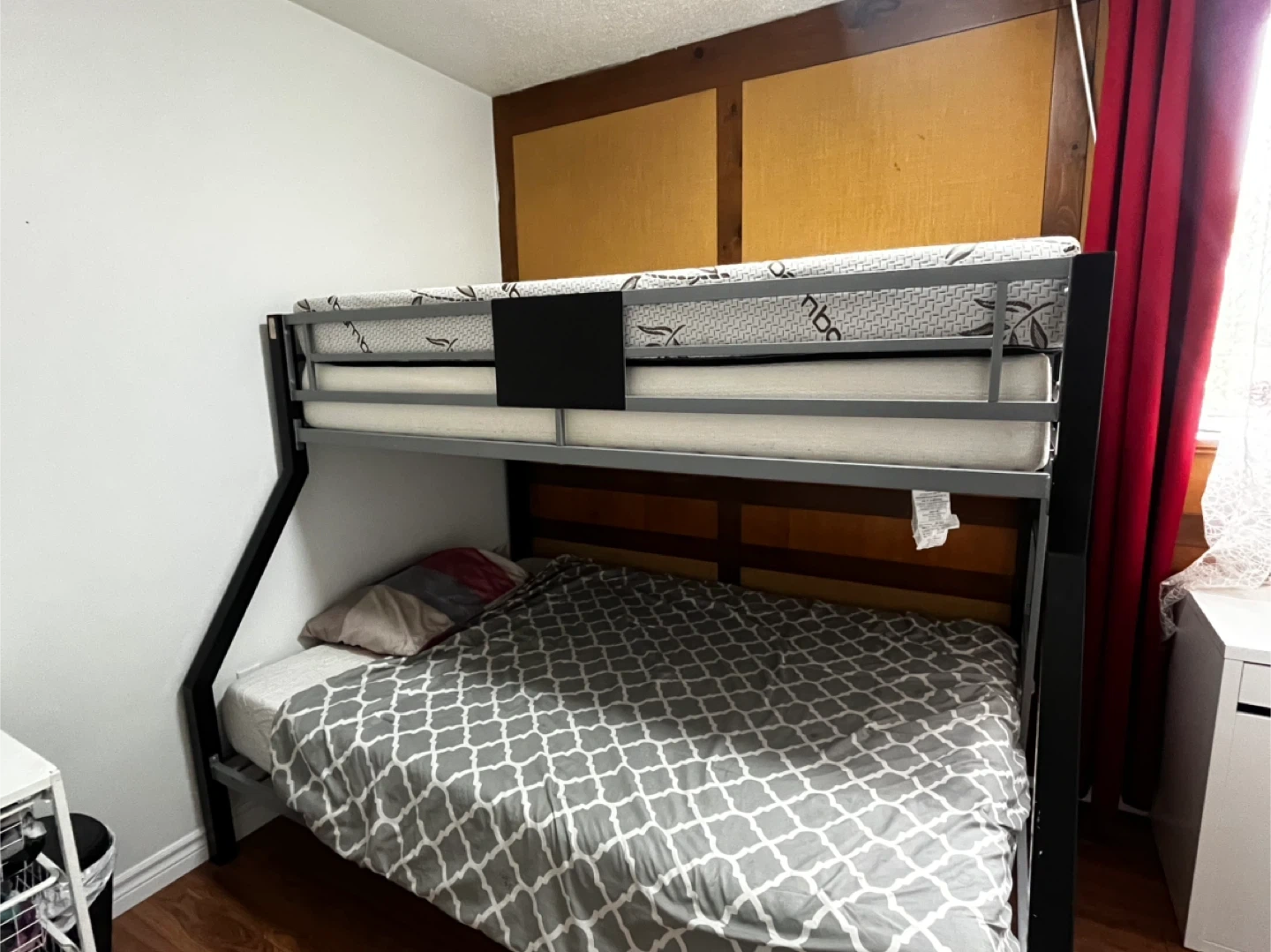 Metal bunk bed frame, comes with two mattresses. The bottom bunk has a grey and white patterned duvet. Some assembly required.