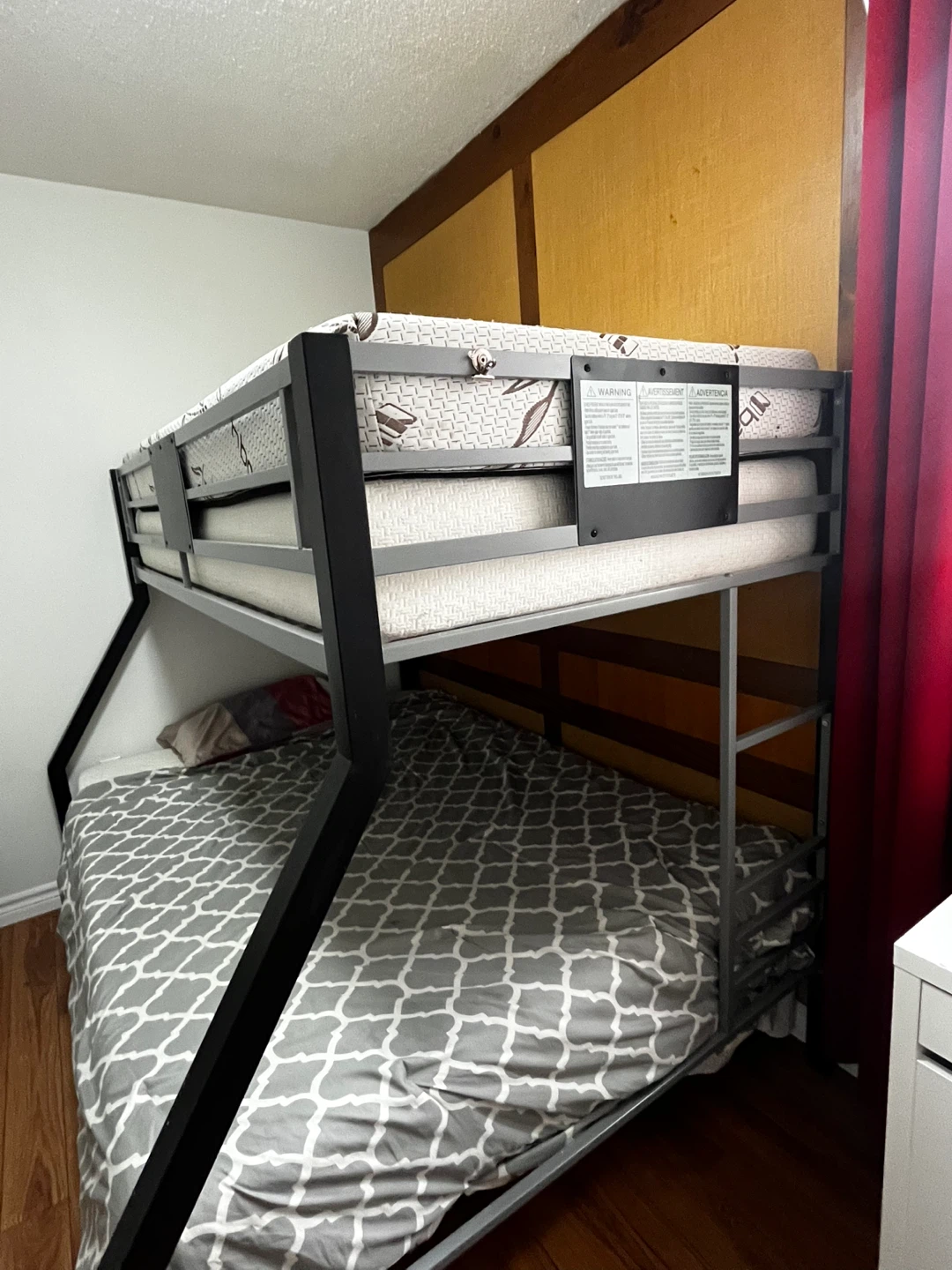Metal bunk bed frame, comes with two mattresses. The bottom bunk has a grey and white patterned duvet. Some assembly required.