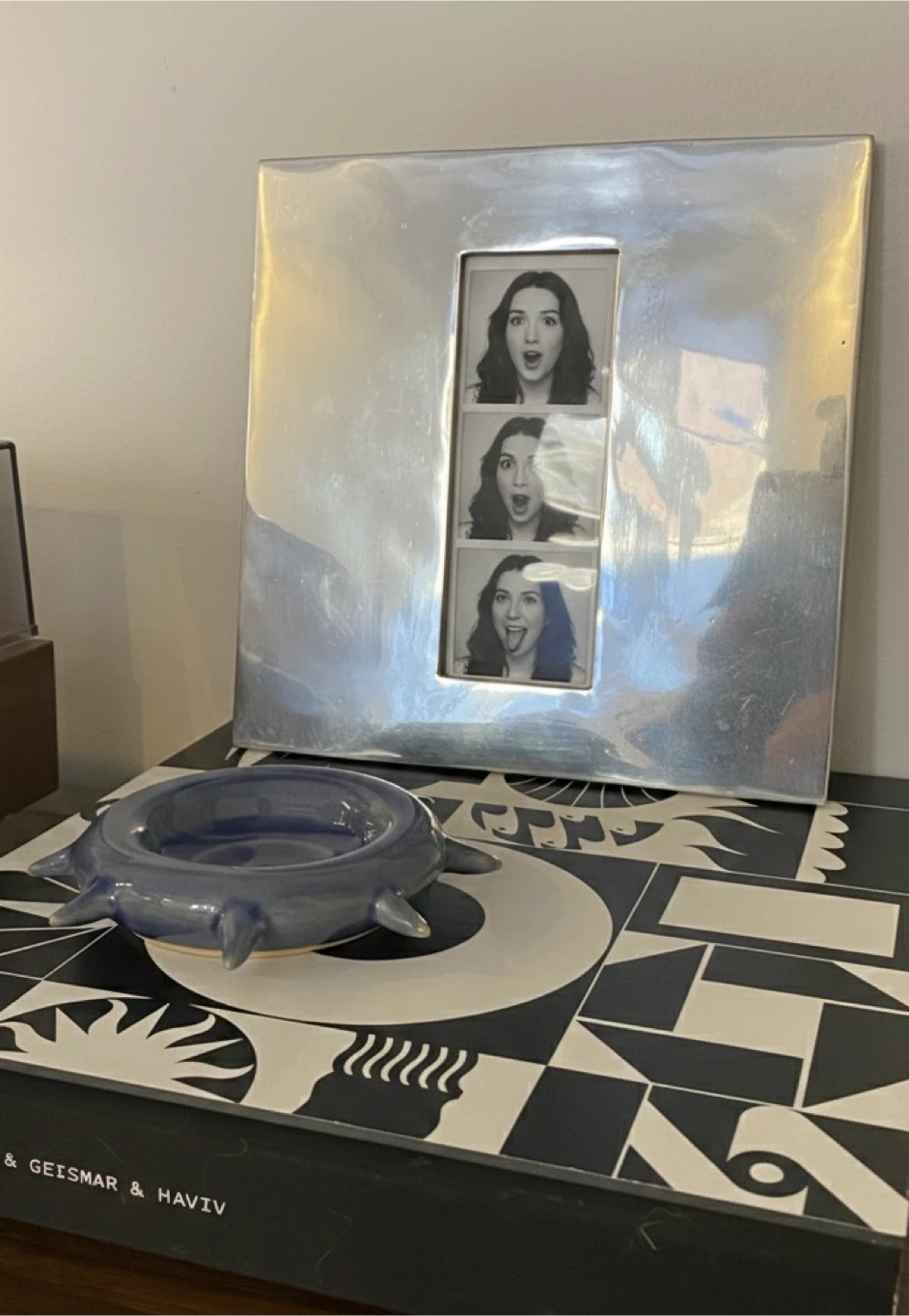 Holds photo 2.5”x6.5” and total with frame is 9.5” squared.