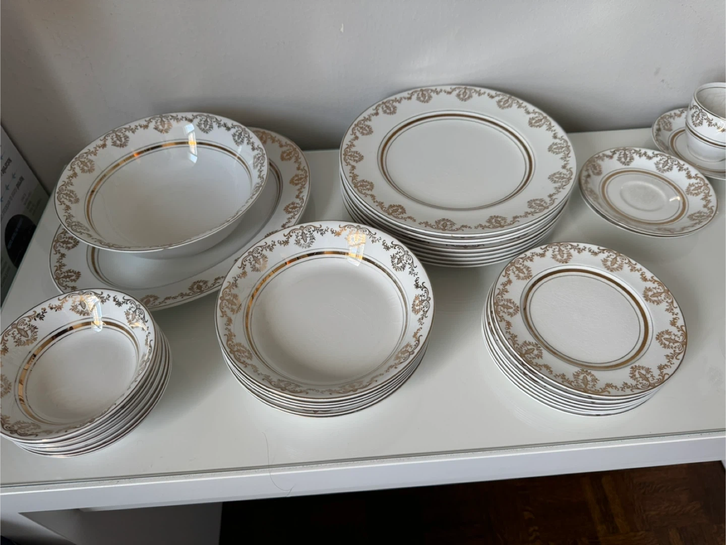 This elegant dinnerware set is a vintage Alfred Meakin "Empire Gold" china set featuring 22k gold trim and accents.