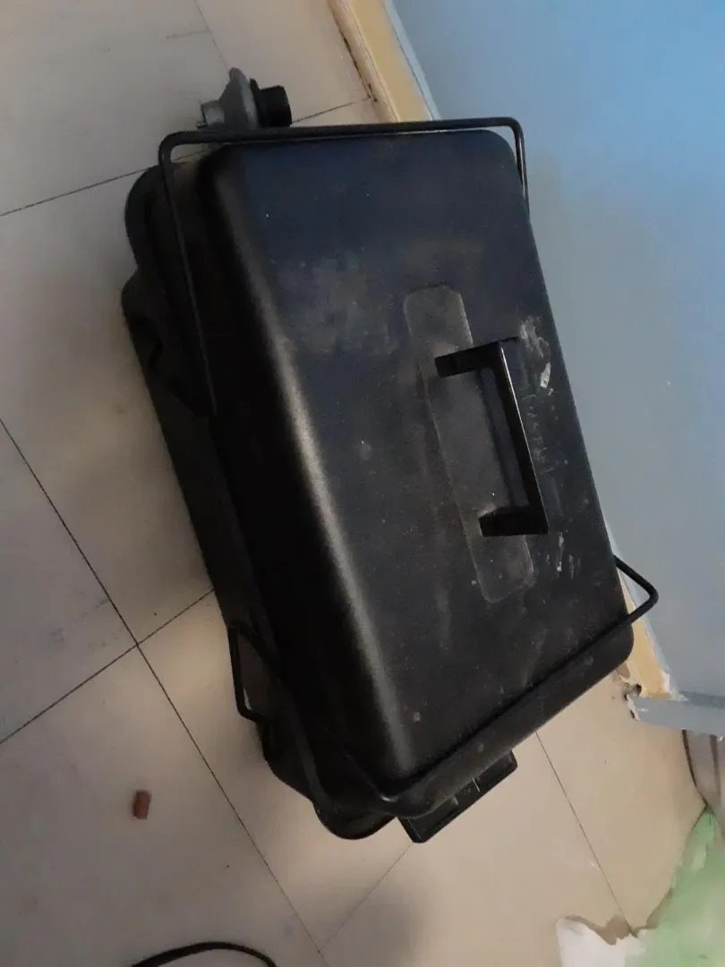 This is a black portable cooler box with a sturdy handle for easy carrying. Its compact size makes it convenient for picnics or day trips. Keeps your food and drinks cool on the go!