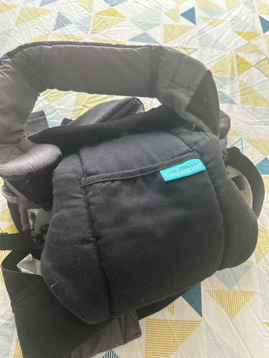 This black Infantino baby carrier is designed for comfort and convenience. It features padded shoulder straps and a supportive waist belt. It's made from durable fabric.