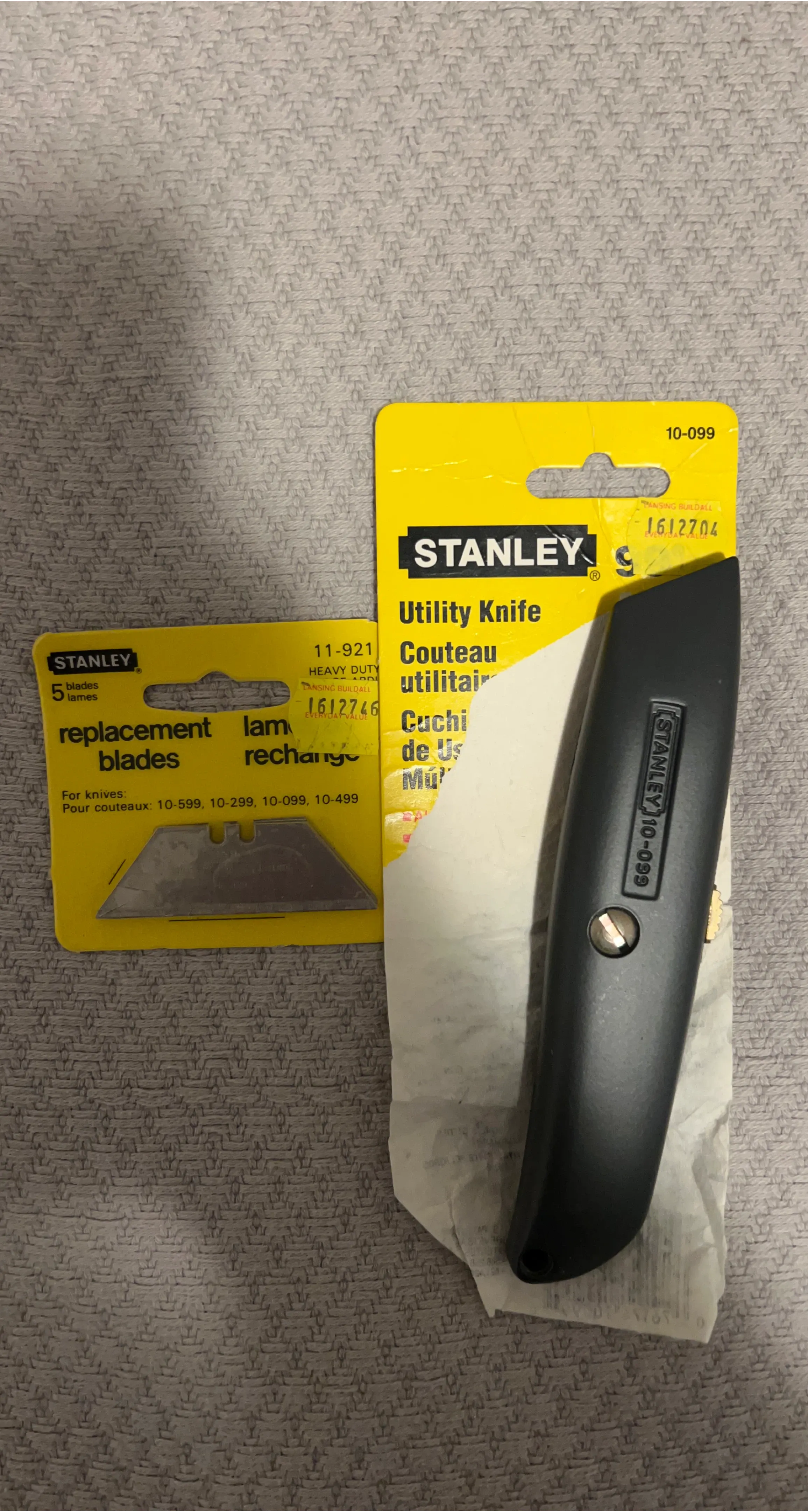 Stanley utility knife, model 10-099. Comes with a pack of replacement blades. This is a heavy-duty utility knife.