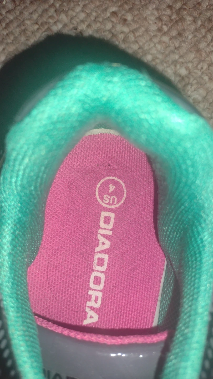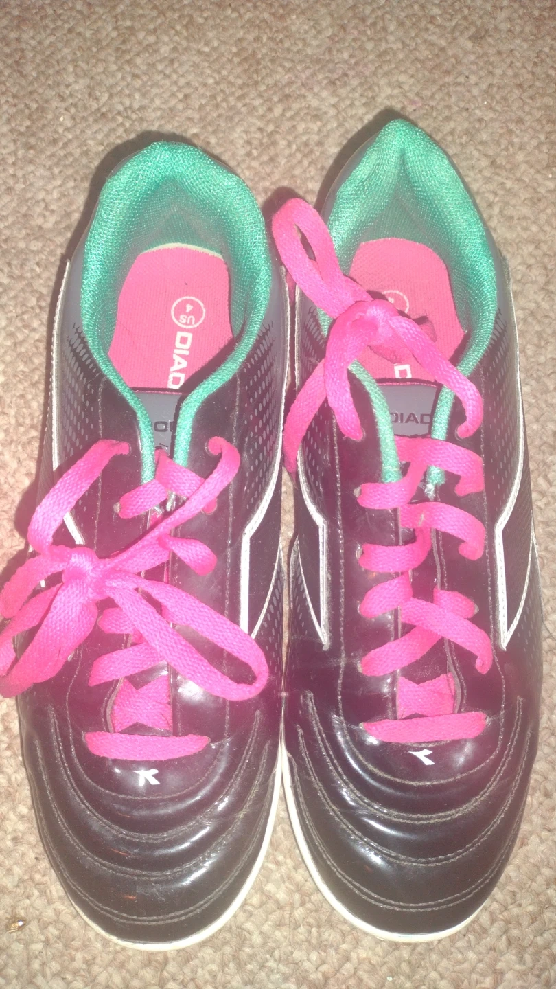 These Diadora soccer cleats feature bright green and pink accents. They're designed for outdoor play with a durable sole. Suitable for youth athletes on the field!