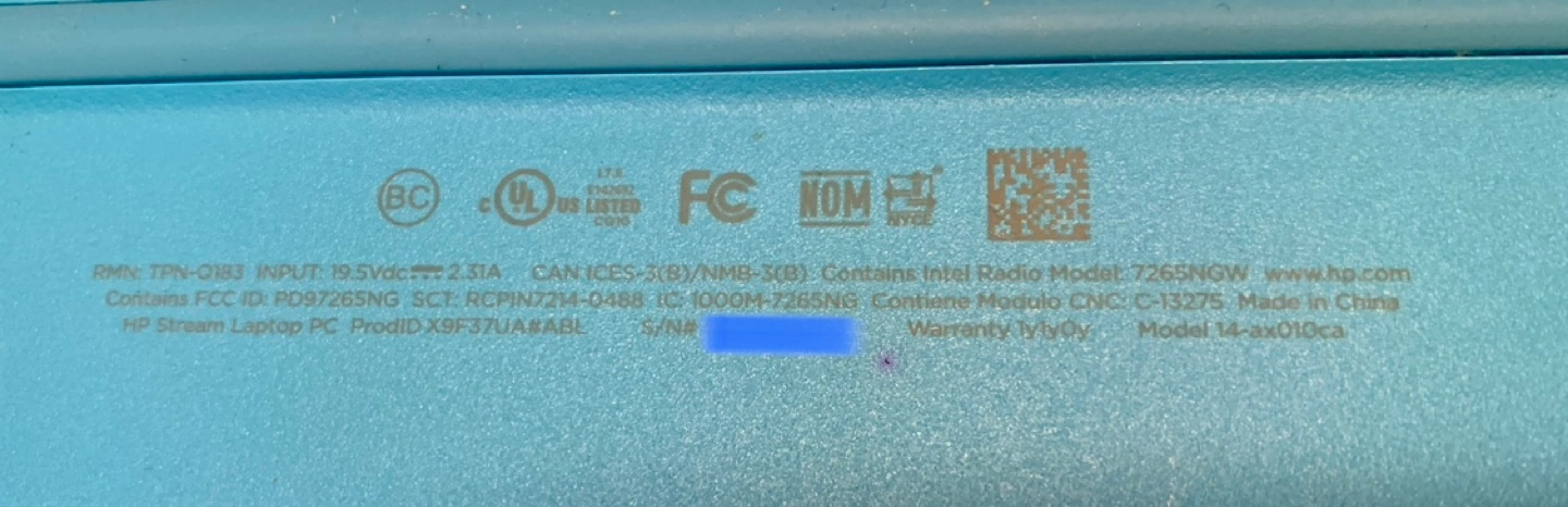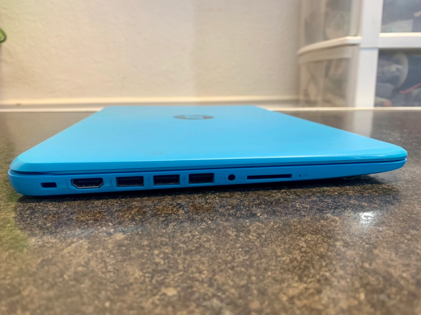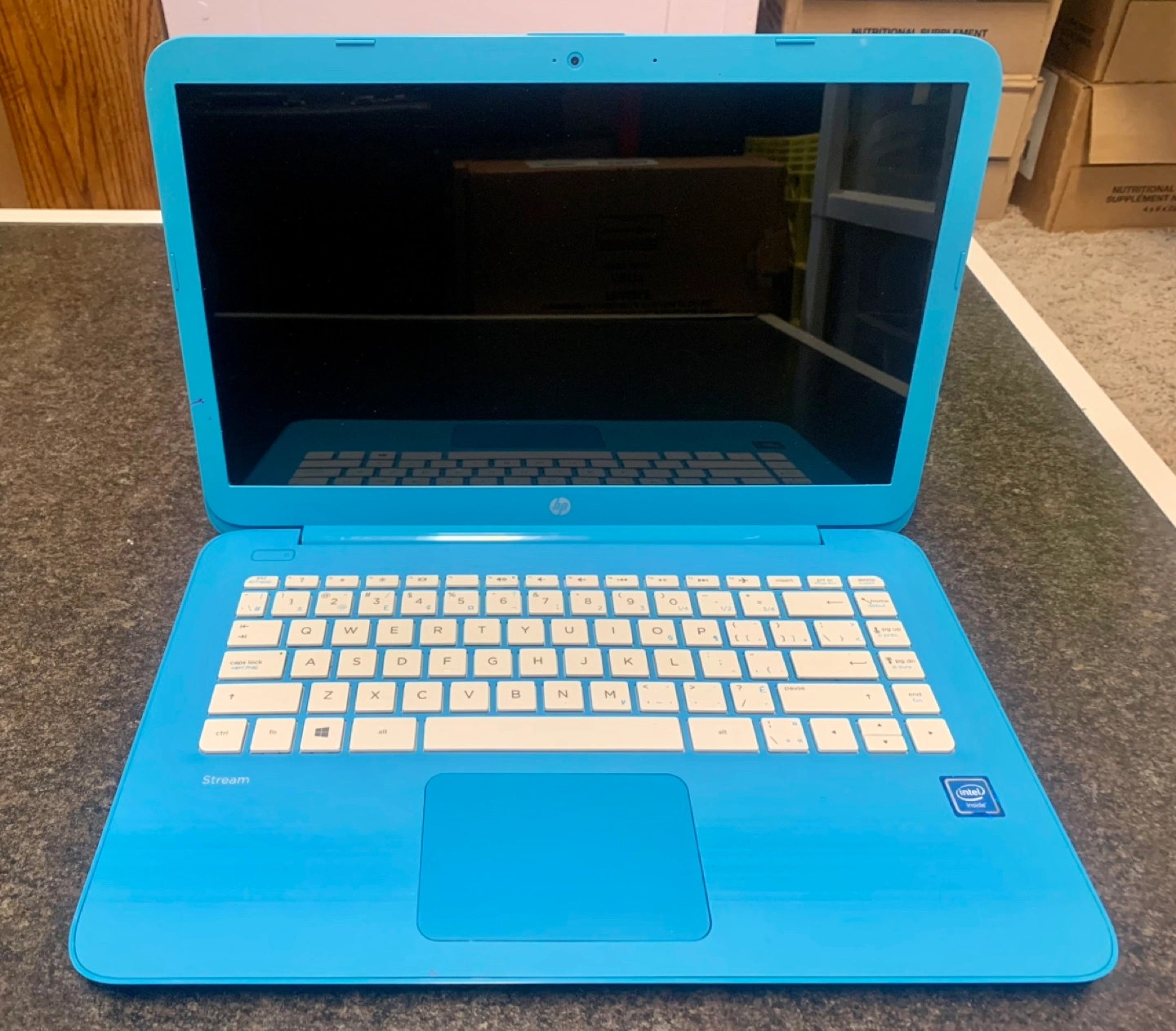 Aqua blue HP Stream 14 laptop with a white keyboard. Selling it because I lost the AC power cable.