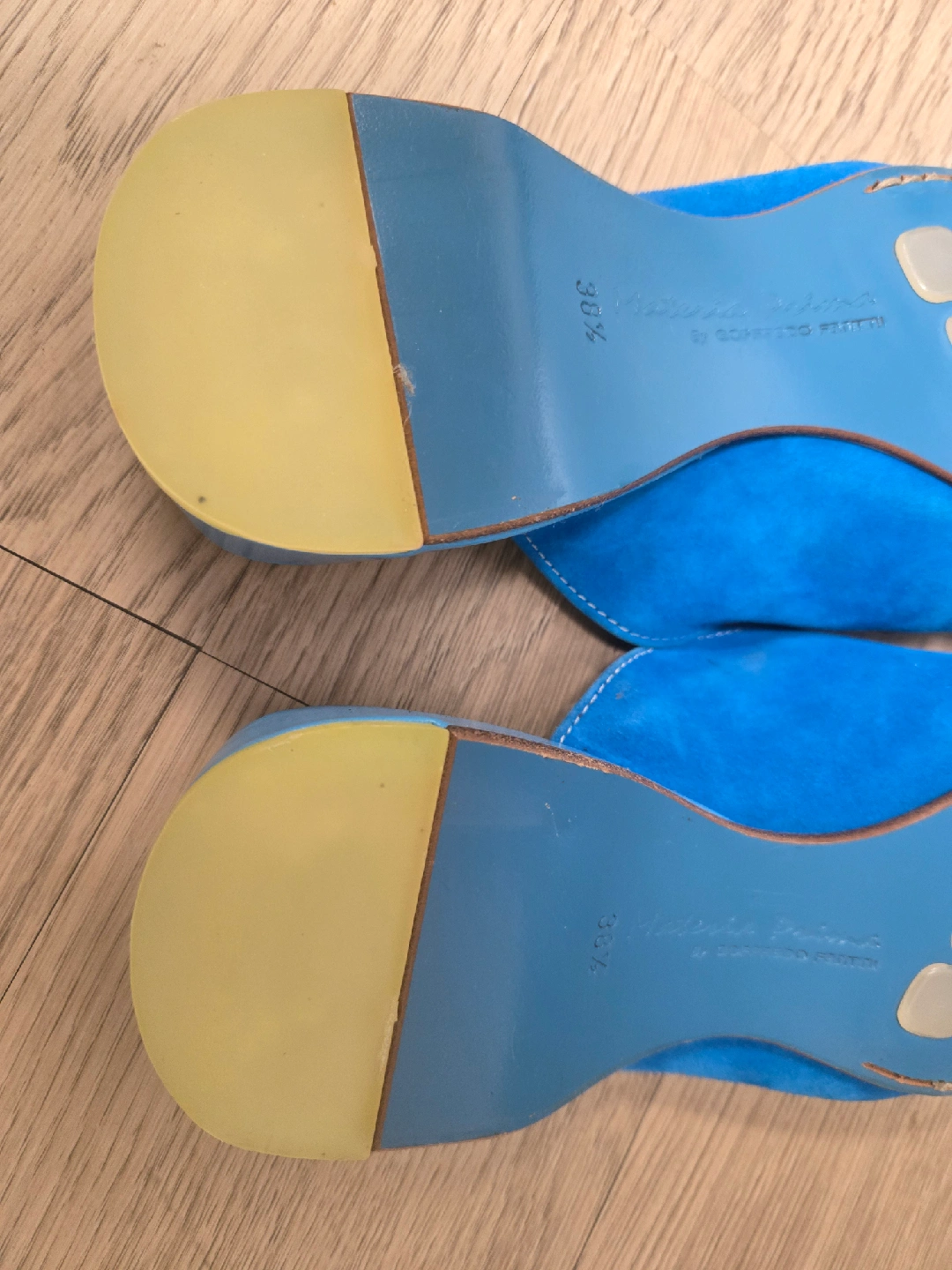 Cute Materia Prima by Goffredo Fantini slides in a vibrant blue! These are size 38 1/2. They have a unique design with beaded accents. Perfect for adding a pop of colour to your summer wardrobe!
