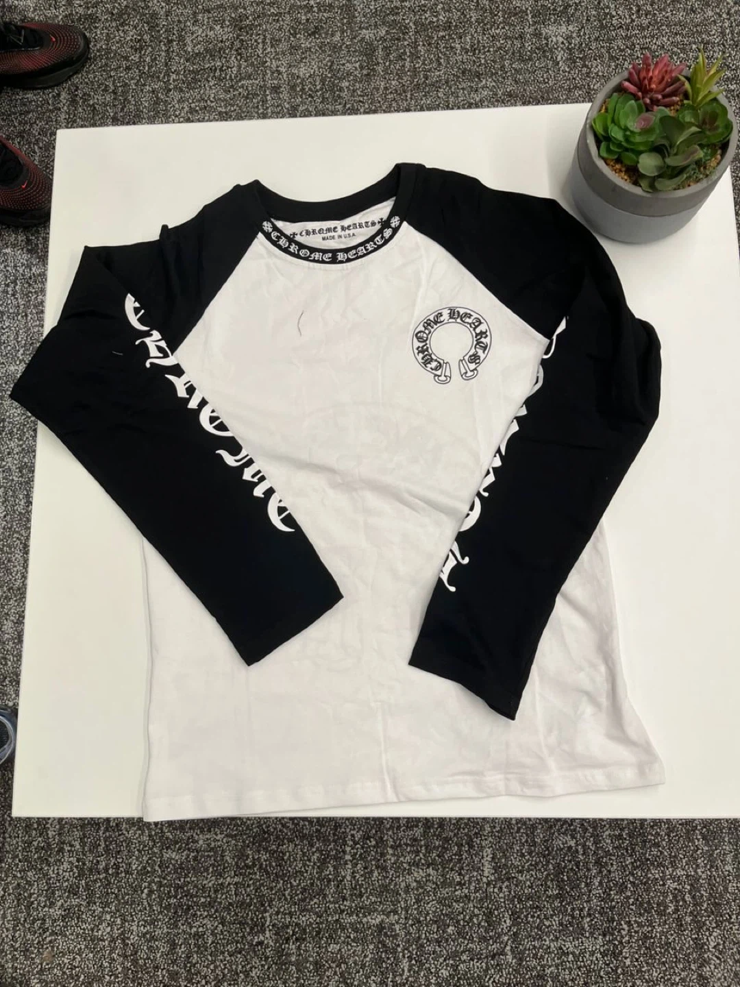 This is a Chrome Hearts long sleeve baseball t-shirt. It features the iconic Chrome Hearts logo on the front and back, with lettering down the sleeves. Made in USA. It's a classic raglan style tee.
