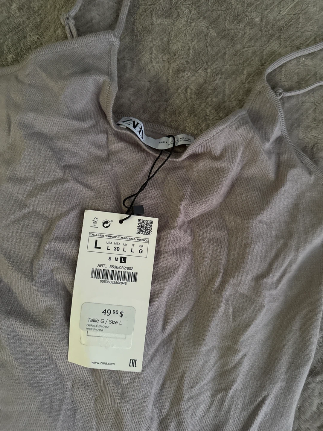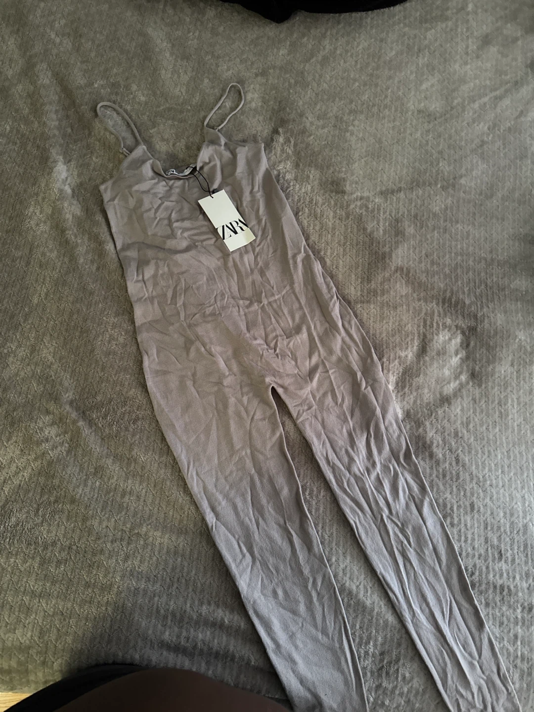 This is a ZARA grey bodysuit with legs. It's a size L and made from a soft knit material. The spaghetti straps and full leg coverage make it versatile. It's great for layering under outfits!