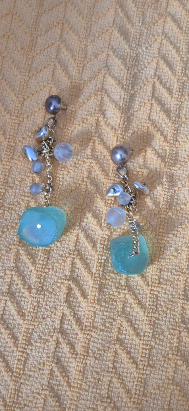 These are a pair of dangle earrings with a silver tone. They feature a ball stud, chain, and decorative beads. The bottom pieces are a semi-transparent blue-ish colour.