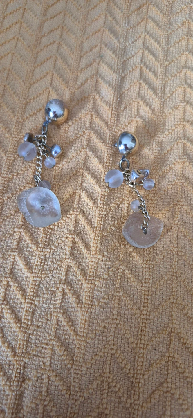 These are a pair of dangle earrings with a silver tone. They feature a ball stud, chain, and decorative beads. The bottom pieces are a semi-transparent blue-ish colour.