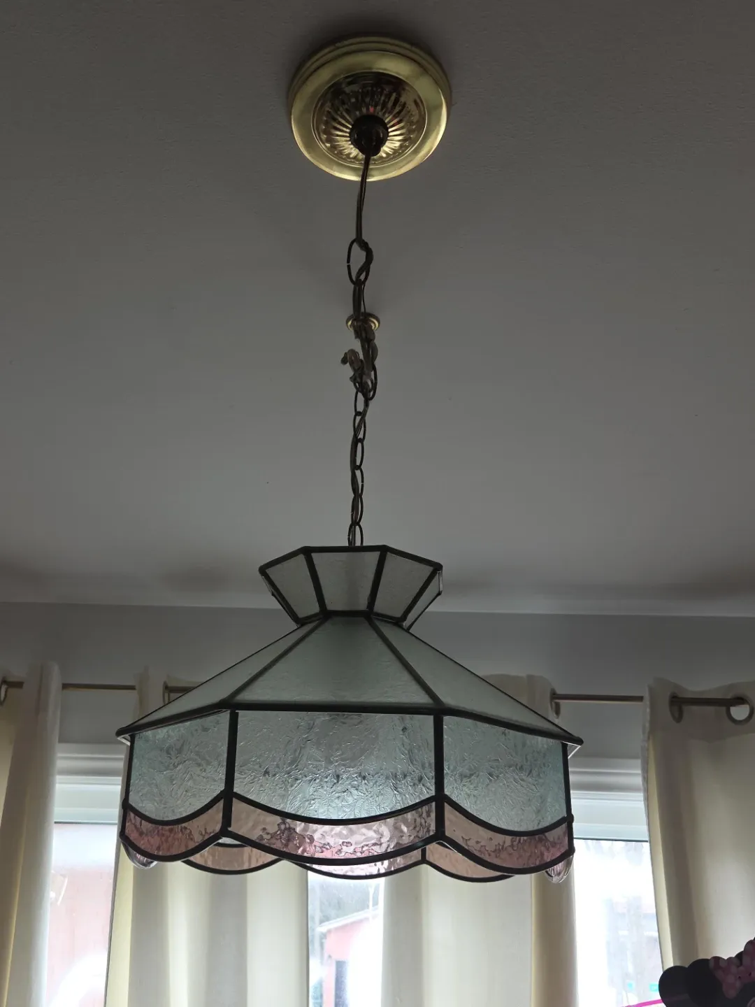 This vintage pendant light features a beautiful stained glass shade with textured clear and pink panels. It's suspended by a decorative brass-toned chain and ceiling mount. Add some charm to your dining area or entryway!