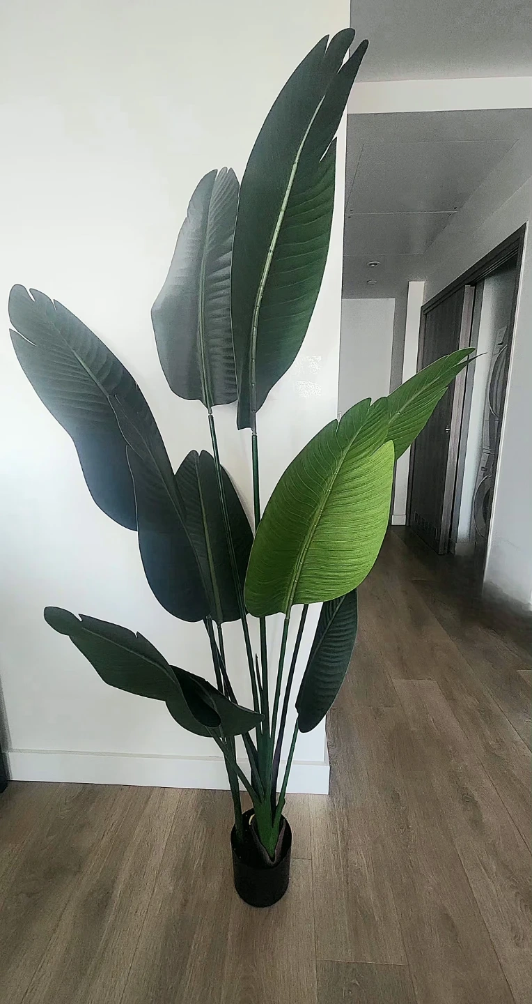 Bring a touch of the tropics indoors with this large faux Bird of Paradise plant. It's housed in a simple black pot. Adds a natural, vibrant look to any room without any upkeep!