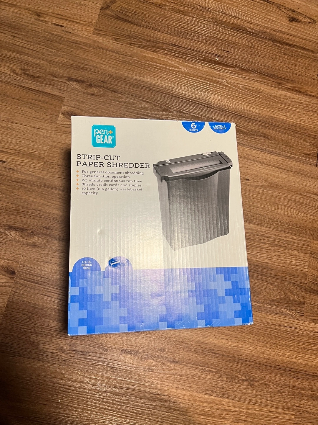 Selling a brand new Pen+Gear strip-cut paper shredder, still in its original box! This shredder is perfect for general document shredding and features a three-function operation. It has a 2-3 minute continuous run time and can shred credit cards and staples. The wastebasket capacity is 10 litres (2.6 gallon). Great for home or office use!