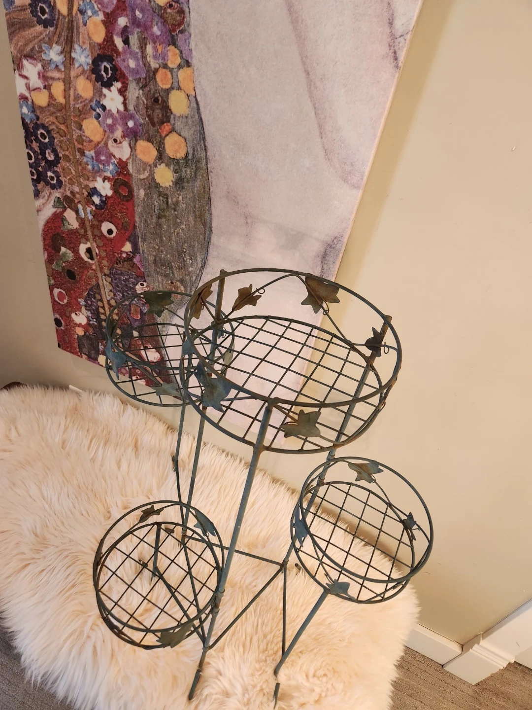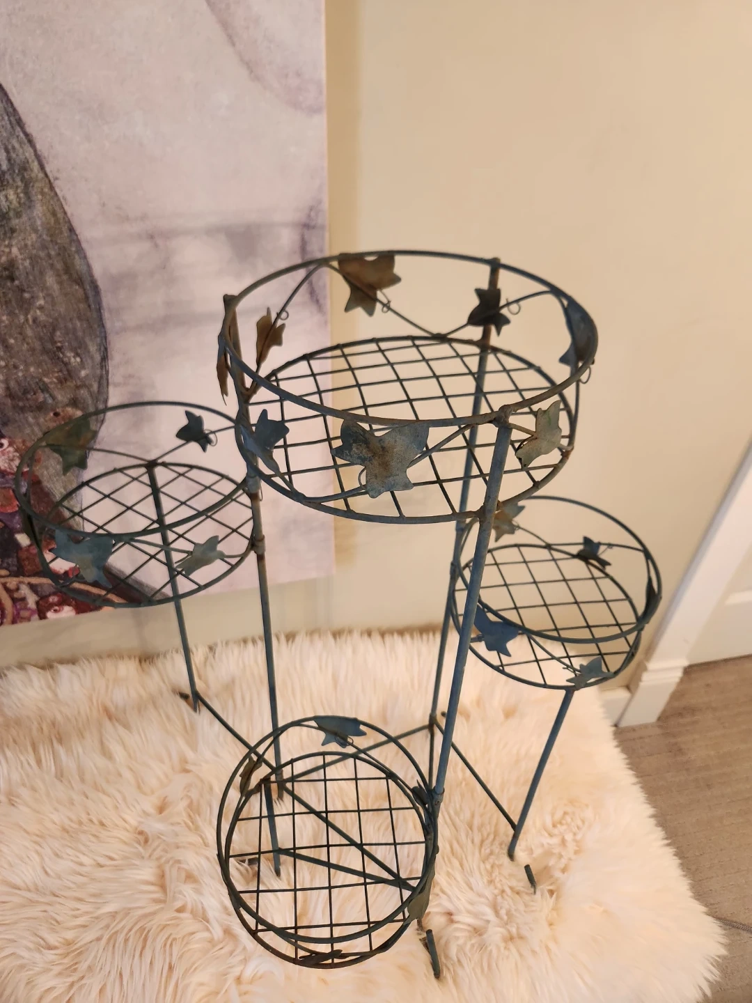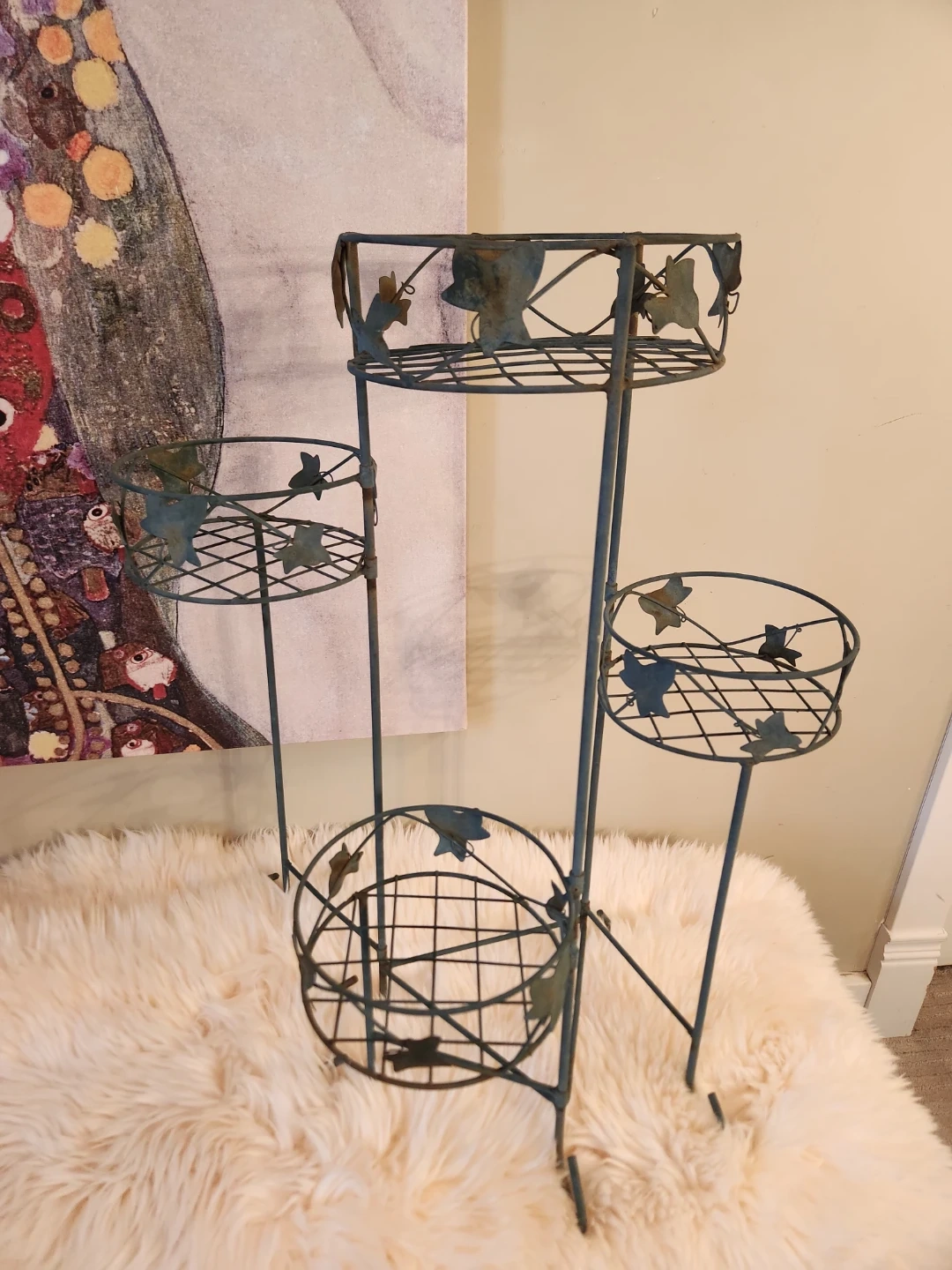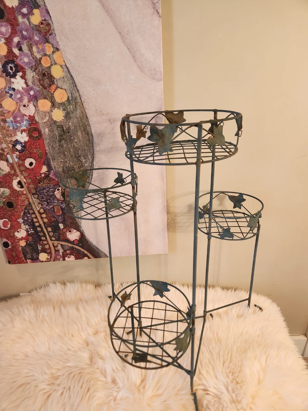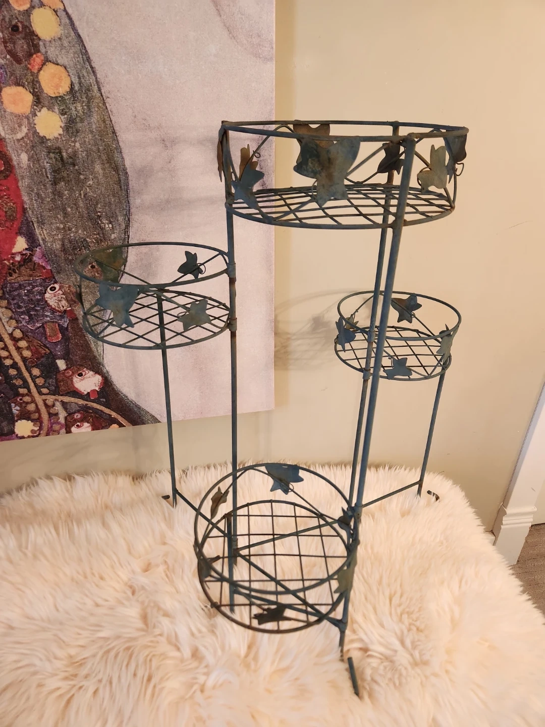 This elegant 80's metal plant stand features 4 tiers with an adjustable lower tier! A decorative leaf design and aged patina is perfect for displaying your favourite potted plants indoors or out. The sturdy construction ensures stability for your greenery!